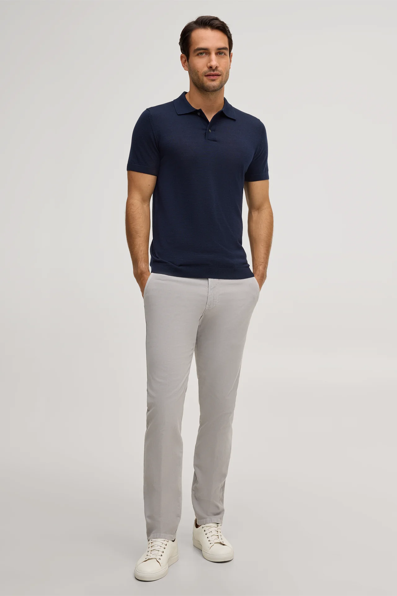Stilvoller Begleiter zu Anzughosen, Chinos sowie dunklen Jeans, das feine Poloshirt Nando verleiht jedem Look den luxuriösen Charakter. Puren Komfort bietet die hochwertige Qualität in Materialmischung aus Wolle mit Cashmere und Seide. Rippbündchen, der präzise Polokragen sowie eine seitliche Logo-Flag runden das Essential stimmig ab.