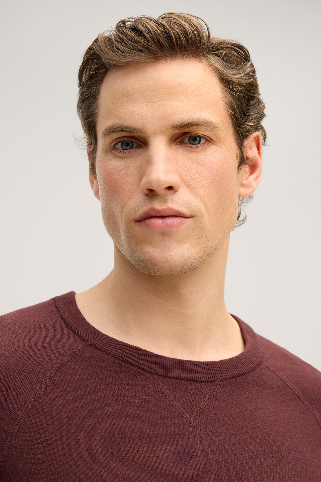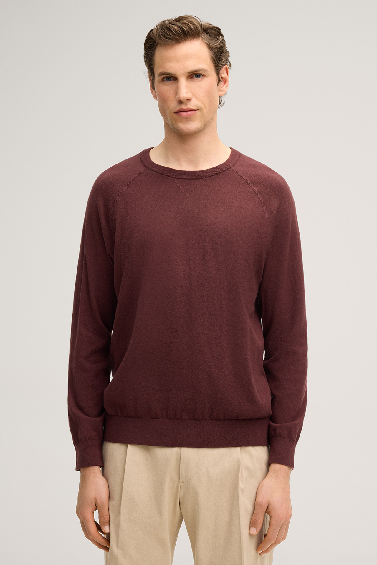 Der fein gestrickte Pullover Cashmilo begeistert in einer Mischung aus Baumwolle, Seide und Cashmere als komfortabler Begleiter. Raglanärmel und ein klassischer Rundhalsausschnitt heben das Design hervor, ergänzt durch Rippstrickbündchen. Akzente setzen das tonige V-Stitching sowie Overlocknähte.