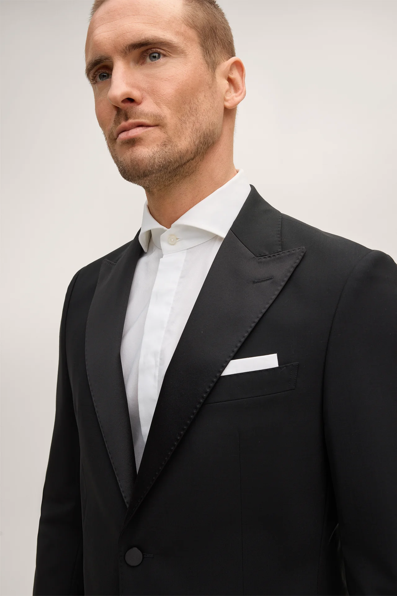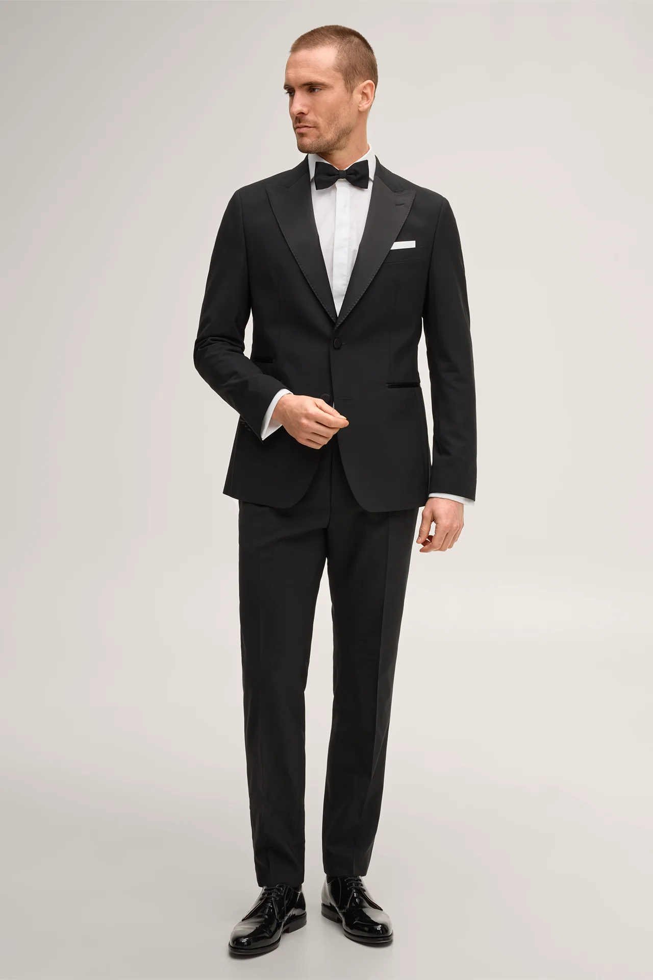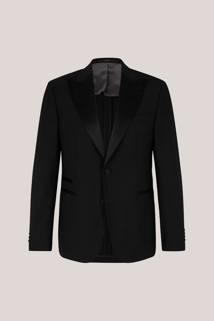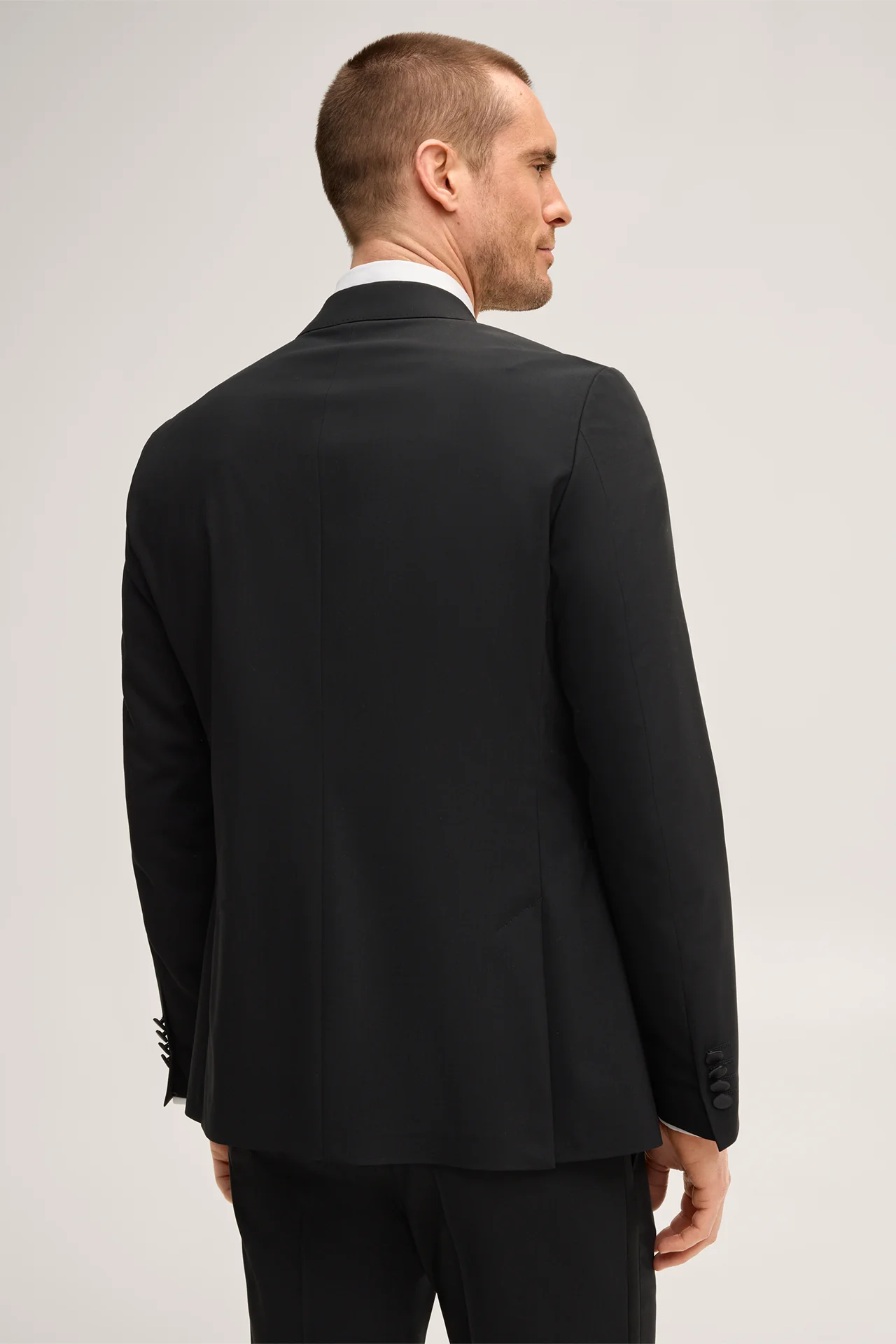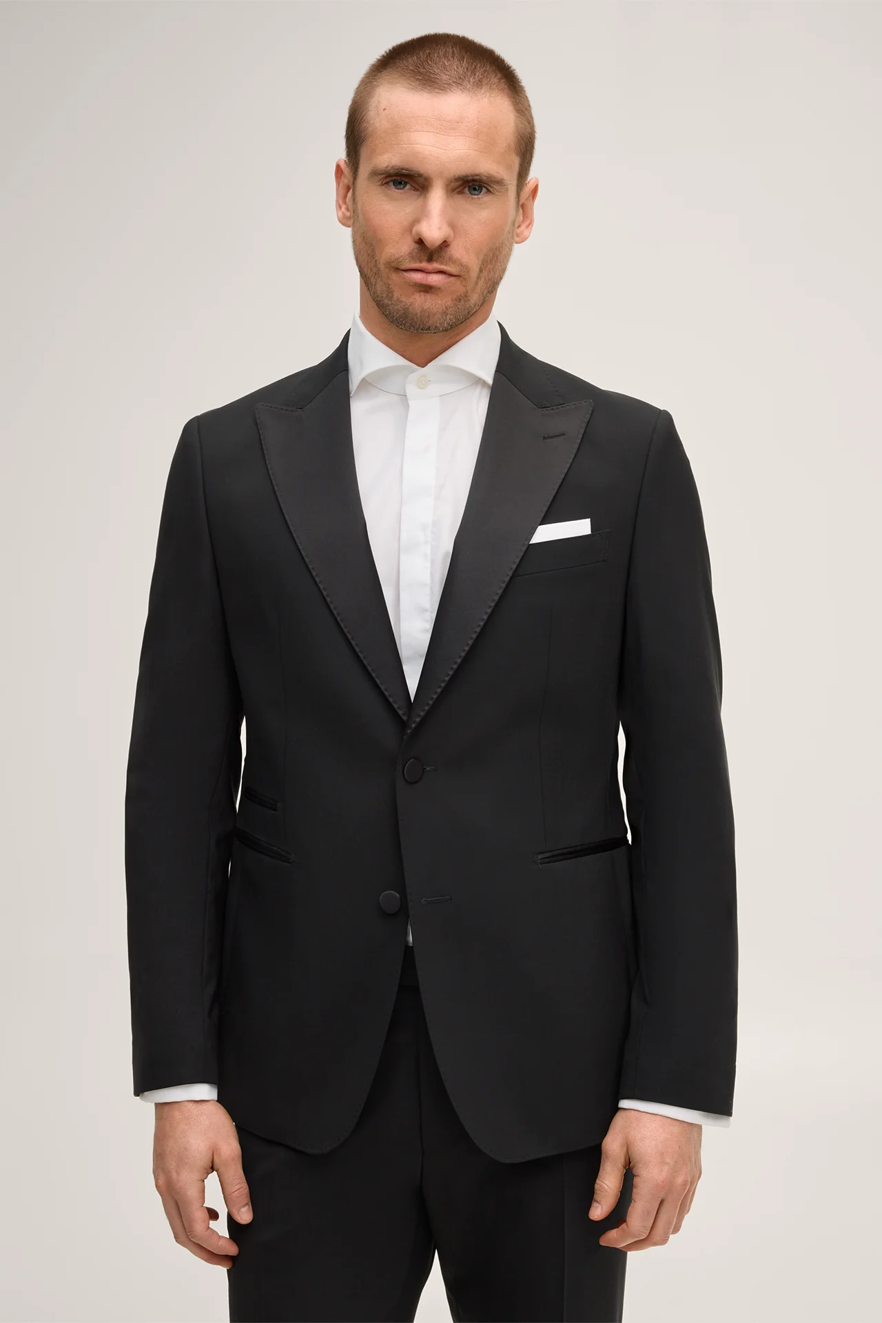 Im klassischen Design mit steigendem Revers und überzogenen Knöpfen begeistert das Smoking-Sakko Toni als stilvolles Item. Details wie Zierärmelschlitze und paspelierte Taschen ergänzen den Look, während AMF-Stitchings feine Akzente setzen. Für Komfort sorgen die stretchige Qualität aus Schurwolle sowie Bewegungsschlitze.