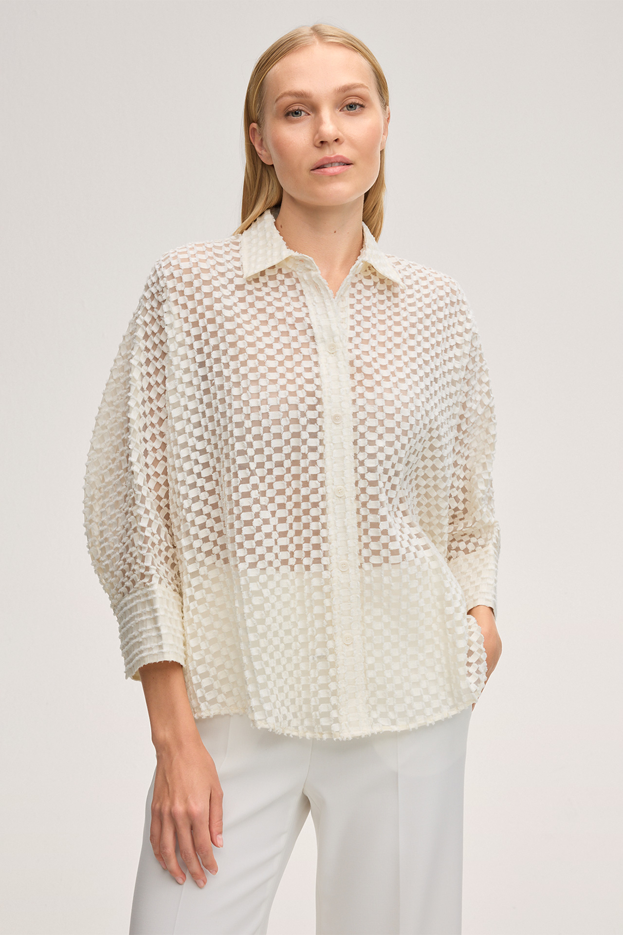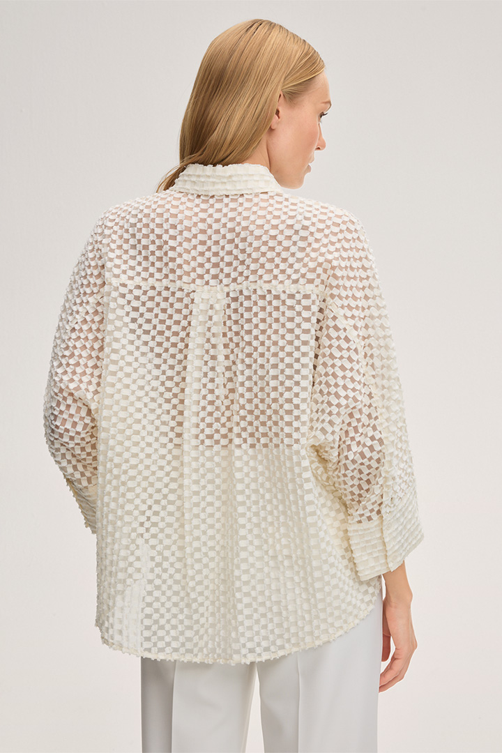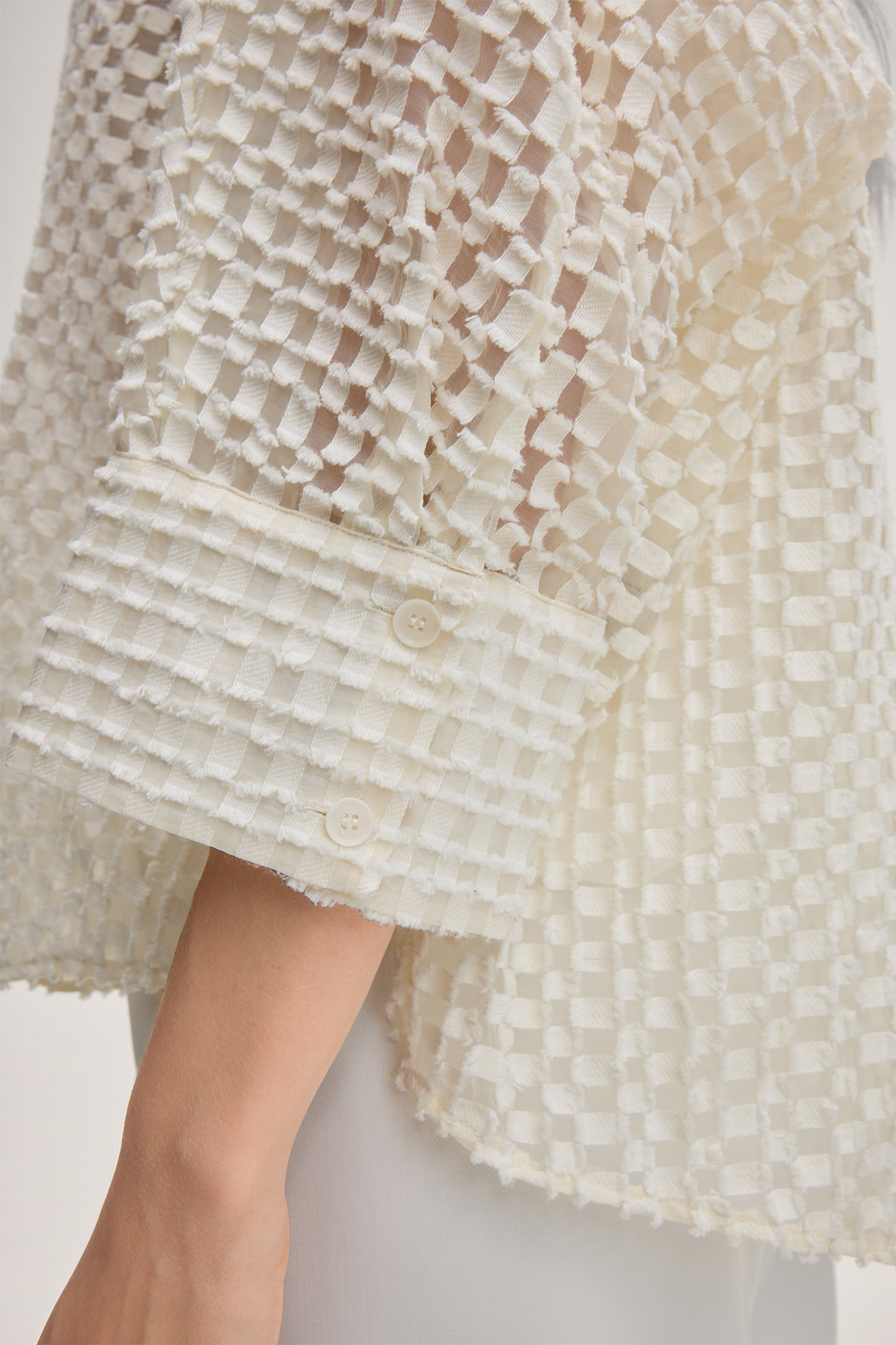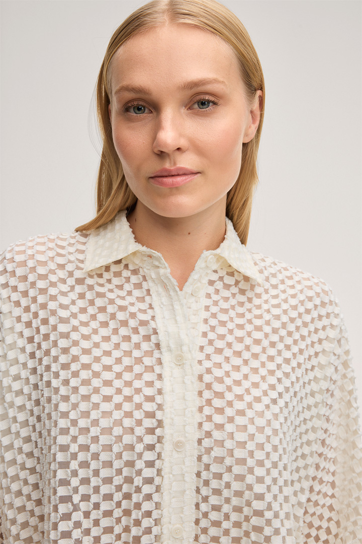 Die strukturierte, partiell transparente Qualität aus Baumwollmischung verleiht der Hemdbluse einen raffinierten Look. Klassische Details wie der Kragen und Dreiviertelärmel mit knöpfbaren Abschlüssen ergänzen den Style. Für ein feminines Finish sorgt das rückseitige Faltendetail.