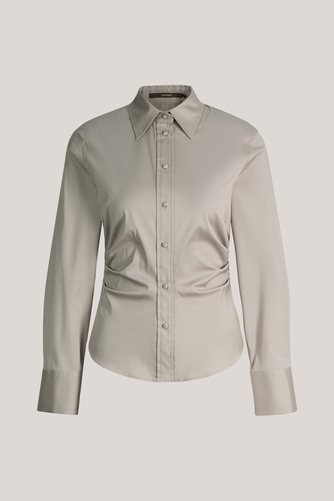 Raffinierte Zierfalten betonen die schmale Silhouette der femininen Bluse, die aus komfortablem Popeline-Stretch überzeugt. Stoffbezogene Knöpfe veredeln das Design, abgerundet durch knöpfbare Manschettenabschlüsse. Das Modell wirkt stilvoll zu Jeans, Chinos und Stoffhosen und ist als vielseitiger Allrounder für Business-Looks eine perfekte Wahl.