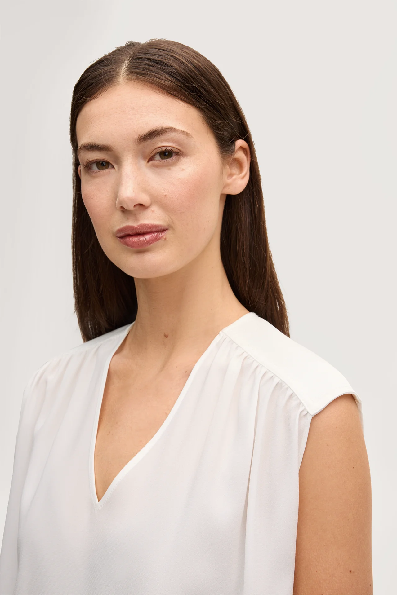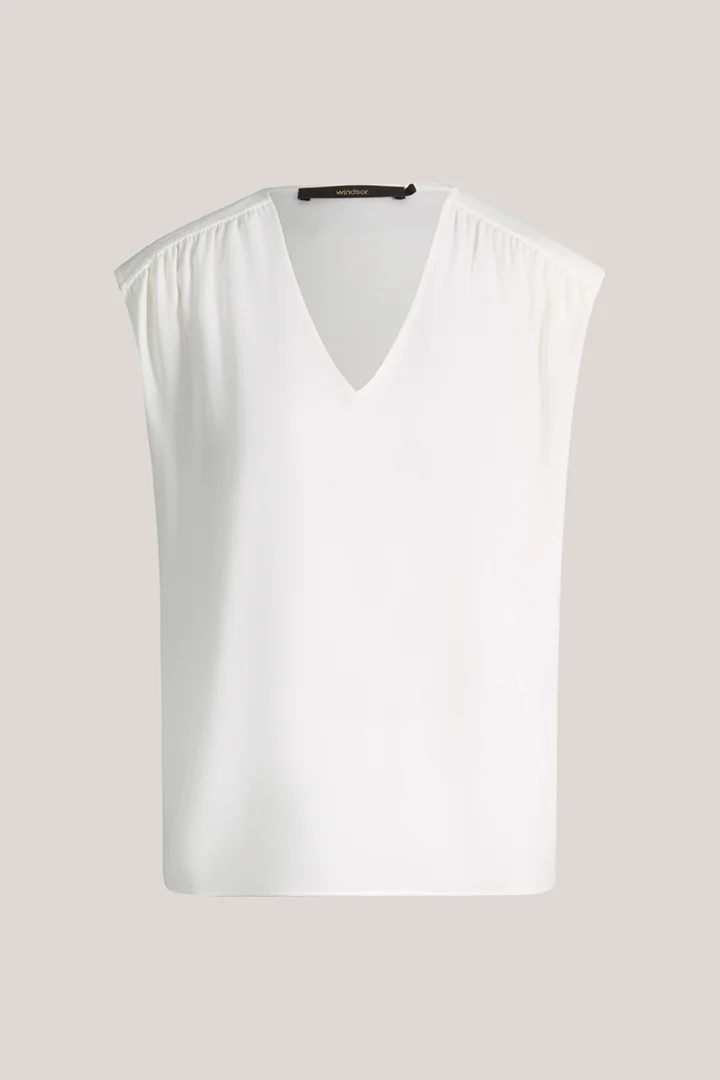 Ob in eleganter Kombination zu Culottes, Anzughosen und Röcken oder als feminines Essential zu Jeans, das Blusen-Top in feiner Crêpe-Qualität veredelt jeden Look. Raffungen an der Schulterpartie und der akzentuierte V-Ausschnitt heben die fließende Silhouette hervor. Für ein stimmiges Finish sorgen paspelierte Abschlüsse.