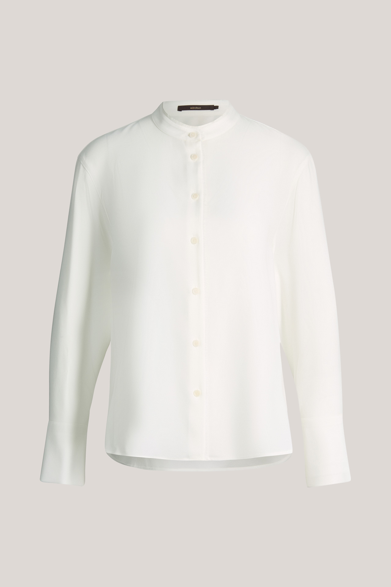 Die Bluse aus fließendem Crêpe erweist sich als femininer Allrounder. Der raffinierte Stehkragen, knöpfbare Ärmelmanschetten und eine durchgängige Knopfleiste heben die Silhouette hervor. Die souveräne Optik erhält durch abgerundete Seitenschlitze ein modernes Finish. Das Essential wirkt stilvoll für klassische und elegante Looks und ist ideal für Büro, formelle Anlässe und feine Events.