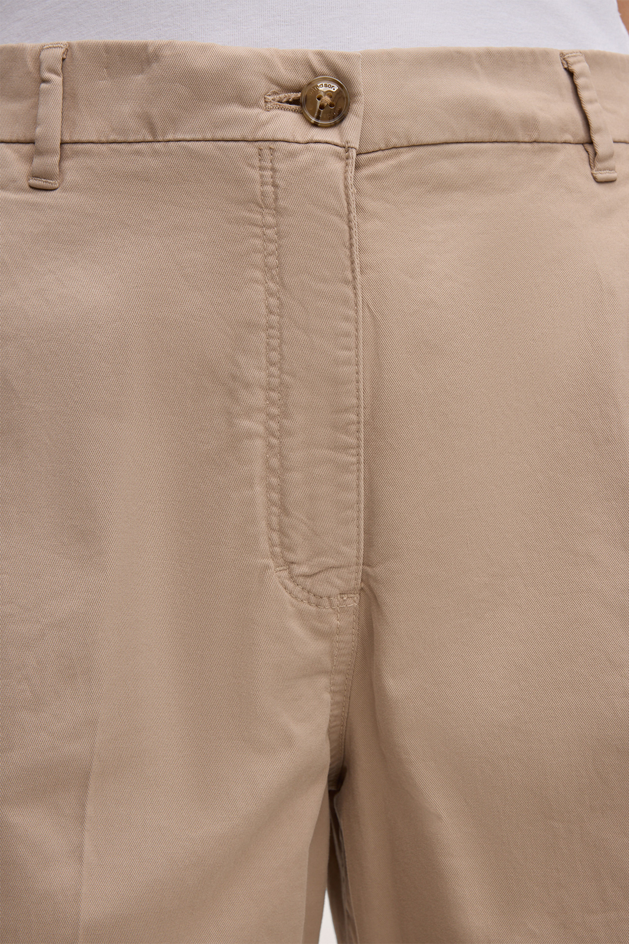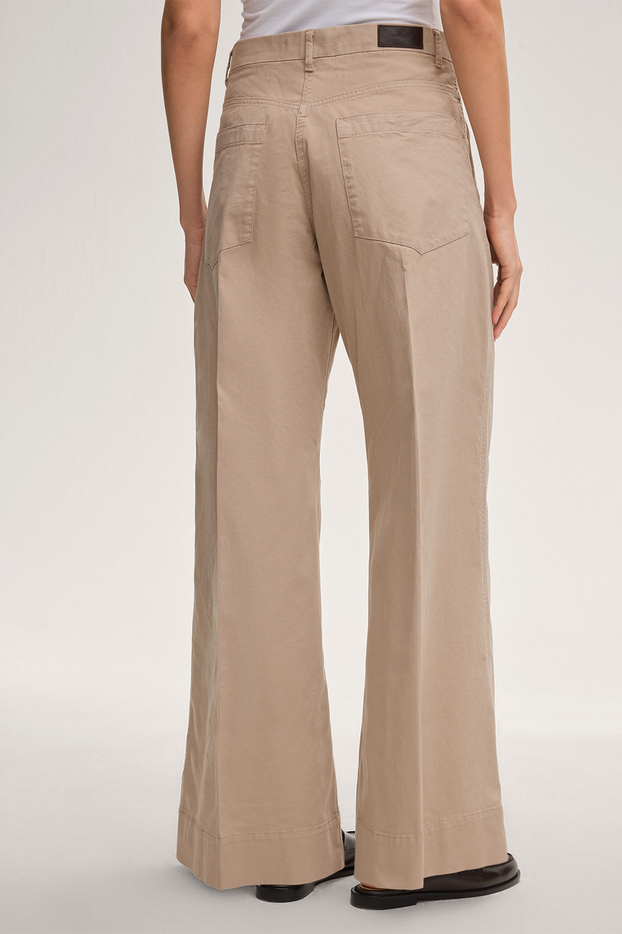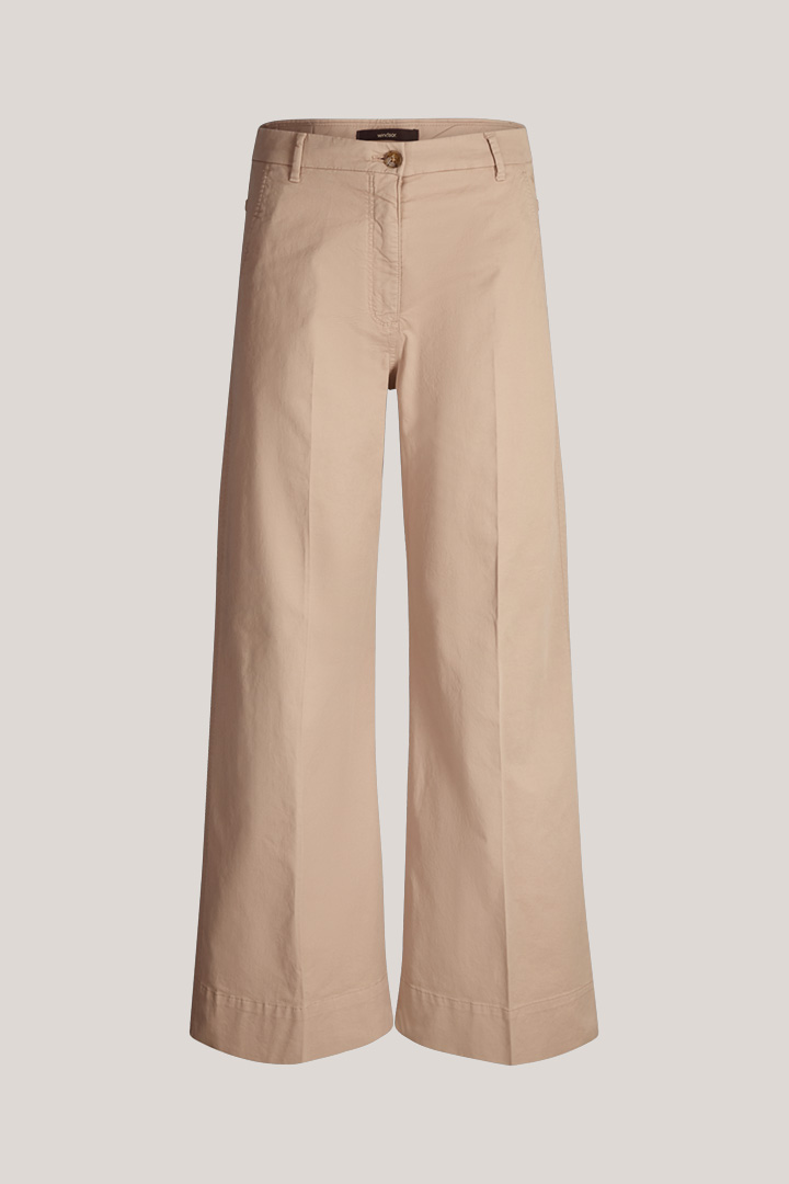 Stretchige Baumwolle zeichnet die Marlenehose als komfortables Piece aus. Das Design heben der klassische Bund mit Gürtelschlaufen und die Schließe aus Knopf und Zipper hervor, ergänzt durch aufgesetzte Gesäßtaschen. Bügelfalten akzentuieren das Item.