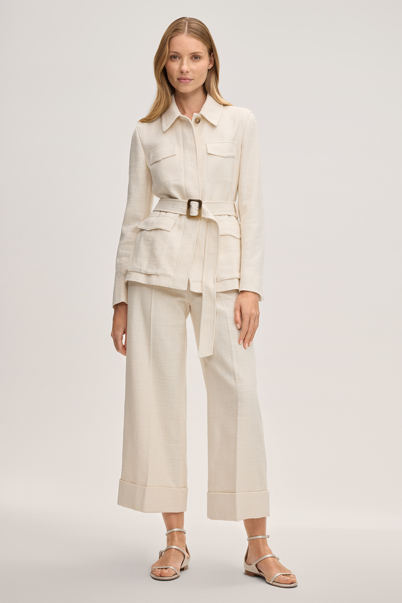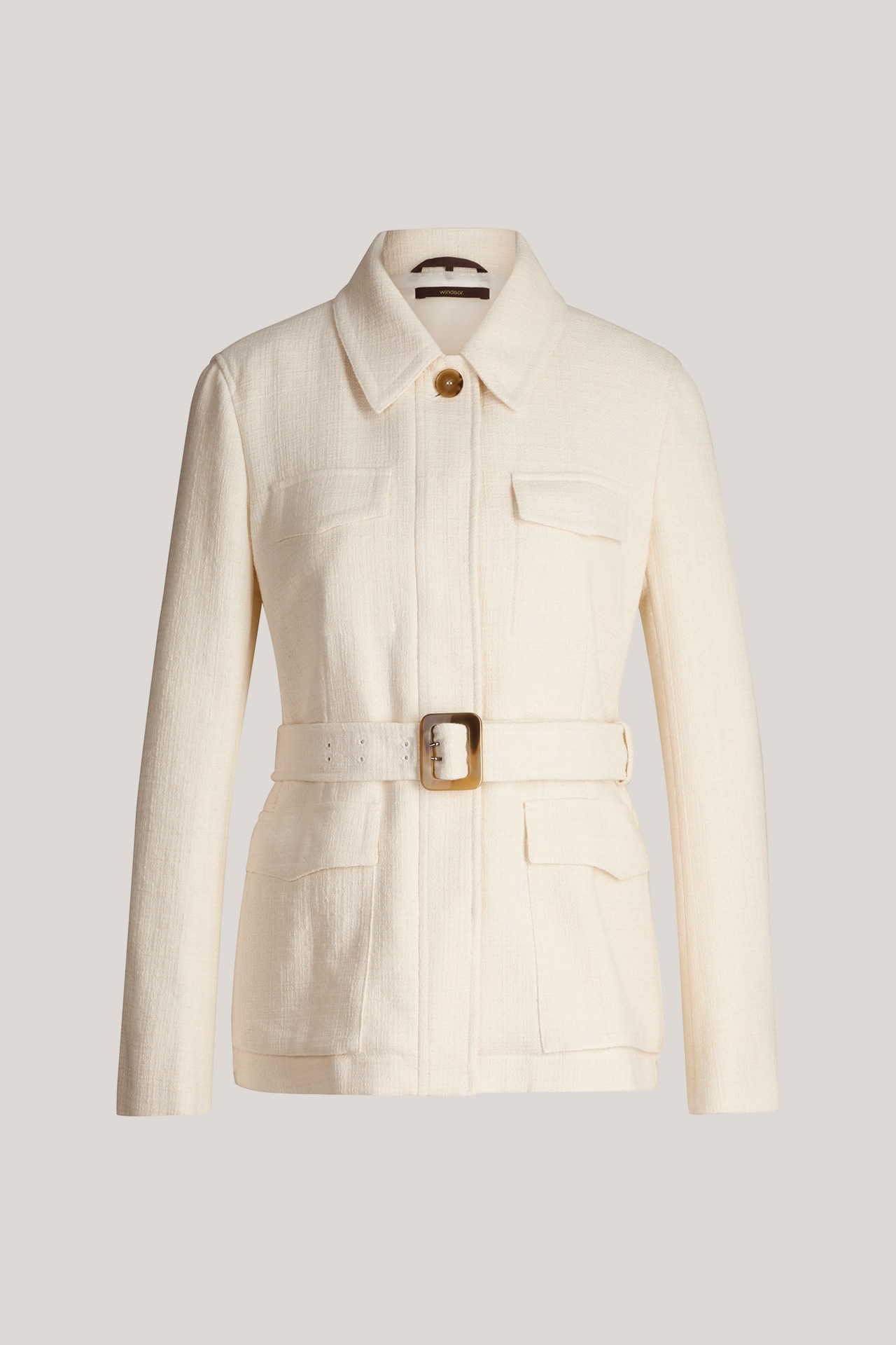 Im stilvollen Design mit Umlegekragen und partiell verdeckter Knopfleiste begeistert die Hemdjacke, stimmig ergänzt durch den Gürtel mit klassischer Dornschließe. Pattentaschen setzen moderne Akzente. Für Komfort sorgen die Bouclé-Qualität im Baumwollmix sowie geschlitzte Ärmelabschlüsse.