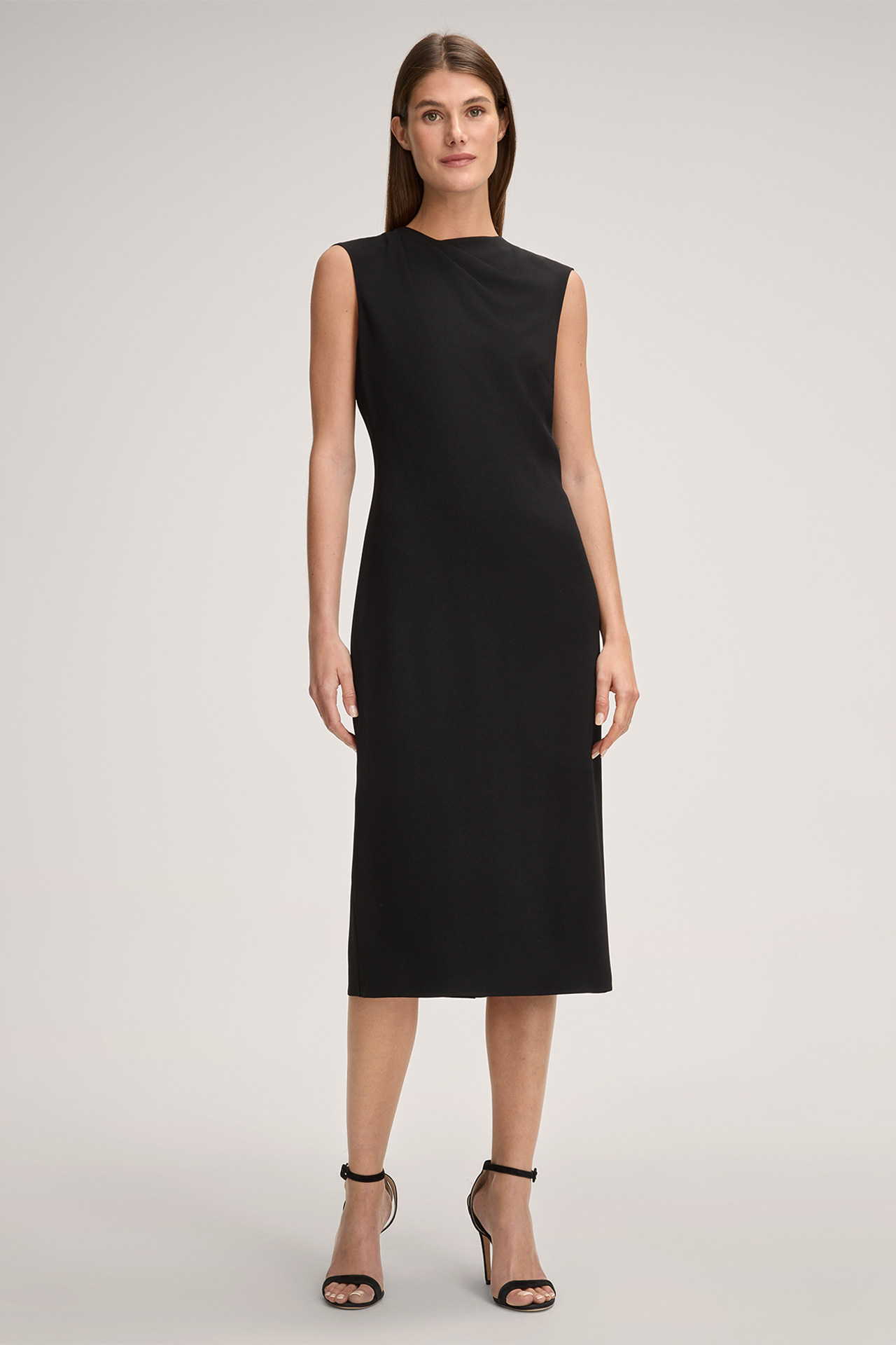 Das Etuikleid überzeugt im raffinierten Design mit Wasserfallkragen, ergänzt durch überschnittene Schultern und den rückseitig geschlitzten Saumabschluss. Ein nahtverdeckter Zipper rundet das Piece stilvoll ab.