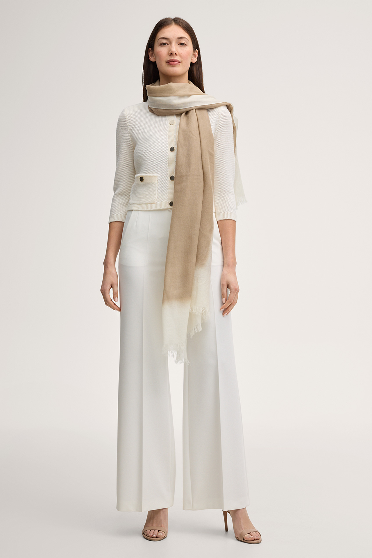 Der moderne Farbverlauf sowie feine Fransenabschlüsse zeichnen die raffinierte Eleganz des Schals aus. Das Accessoire passt zu Kleidern, leichten Jacken und Blusen-Variationen mit Jeans oder sommerlichen Bermudas. Angenehmen Tragekomfort bietet die Verarbeitung aus reiner Schurwolle.