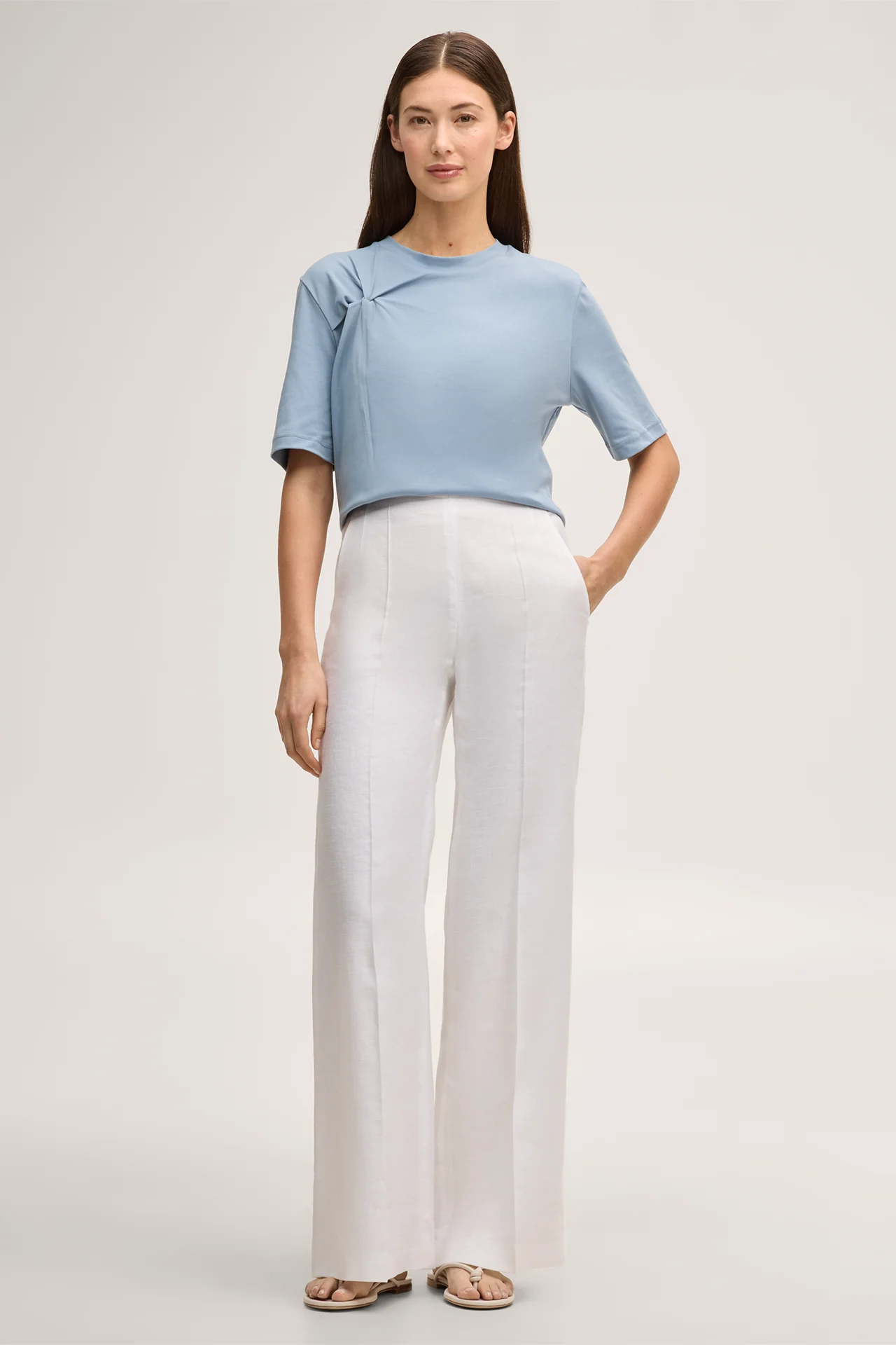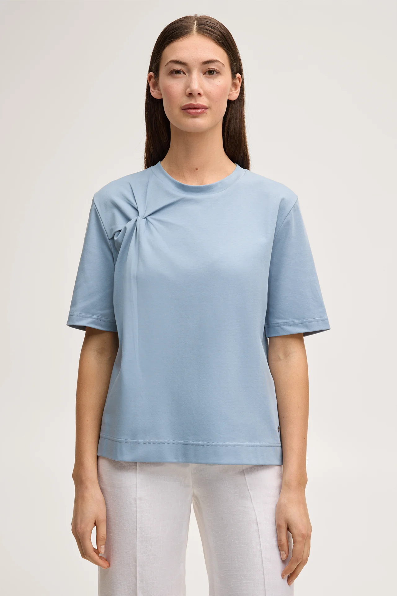 Für selbstverständliche Looks mit Twist erweist sich das T-Shirts mit gesmokter Drapierung in Knotenoptik als vielseitiger Favorit. Das Essential wirkt zu Röcken und Hosen. Klassisch kurze Ärmel, der feminine Rundhalsausschnitt und eine applizierte Logo-Plakette am Saum akzentuieren das stilvolle Design. Für puren Komfort sorgt die Verarbeitung aus reiner Bio-Baumwolle.