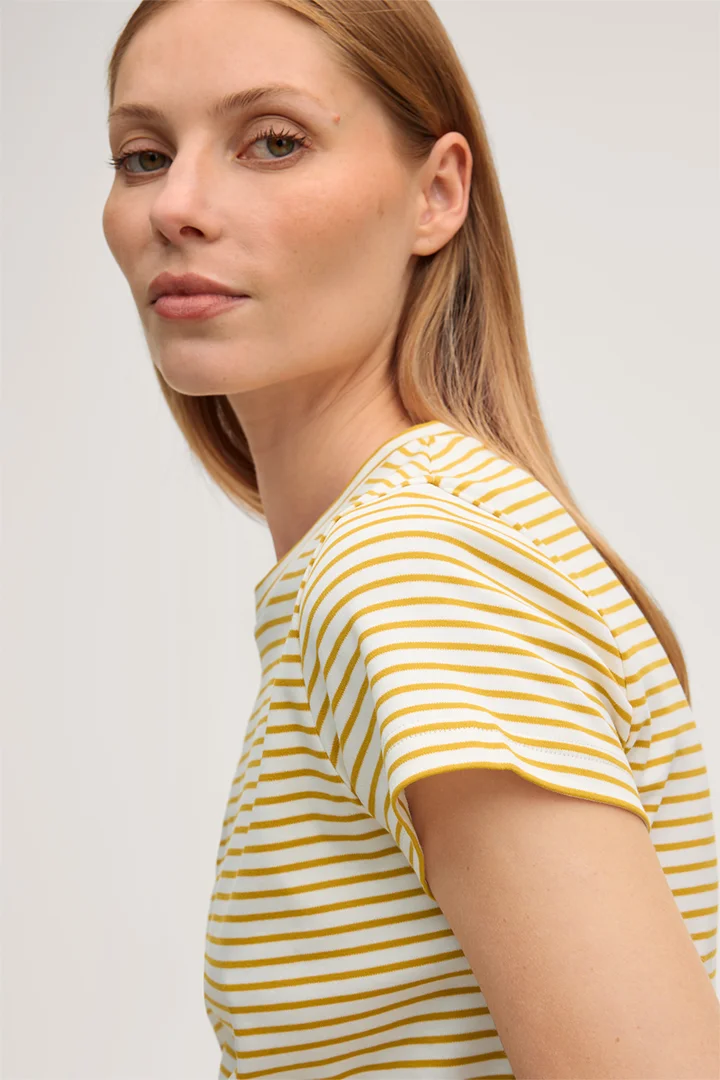 Baumwoll-Interlock T-Shirt in Gelb-Ecru gestreift