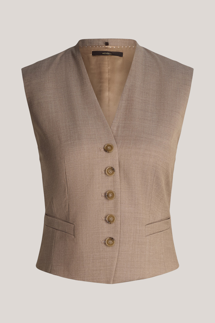 Die feminine Weste ist perfekt in Kombination mit der dazugehörigen Anzughose und dem Blazer für gehobene Anlässe oder im Business. Mit V-Ausschnitt, minimalistischen Paspeltaschen und edler Knopfleiste präsentiert sich das Modell klassisch und souverän. Reine Schurwolle hebt den eleganten Look hervor. Für zusätzlichen Tragekomfort sorgen ein fließendes Futter und der rückseitige Westenriegel.