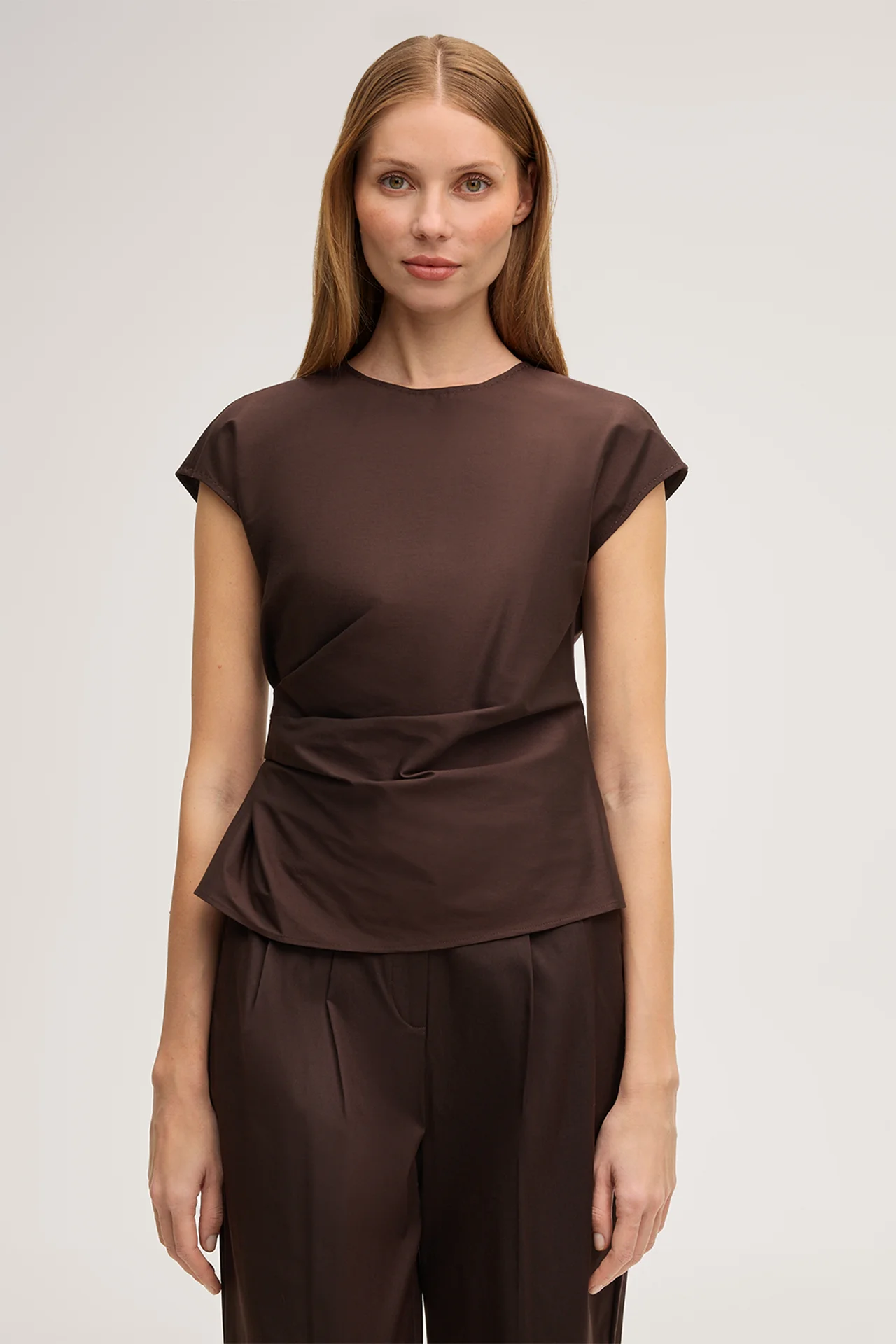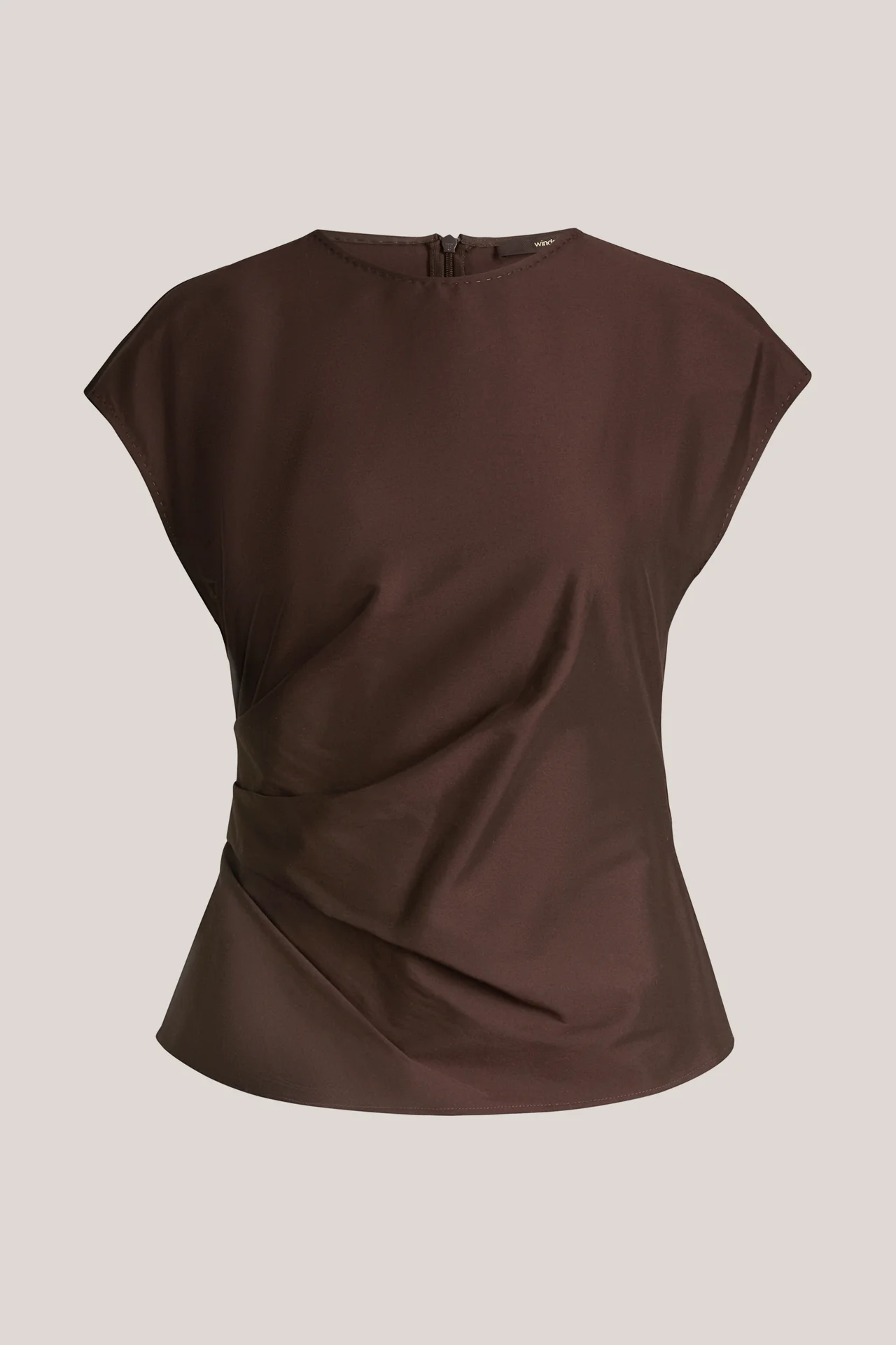 Durch die raffinierte Drapierung an der Taille erhält das unifarbene Blusen-Top das elegante Flair. Kurz angeschnittene Cup-Ärmel und der runde Ausschnitt kreieren die feminine Silhouette. Für optimalen Komfort sorgt ein rückseitiger Zip-Verschluss. Dank der leichten Qualität aus Baumwollstretch überzeugt das Essential als Allrounder für anspruchsvolle Outfits. In Variation mit einem Blazer und den aktuellen Accessoires sowie einer Clutch der Kollektion strahlt das Top pure Nonchalance aus.
