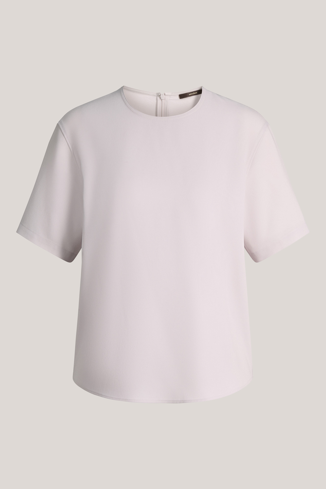 Die feminine Bluse in Crêpe-Qualität erweist sich als puristisches Piece für facettenreiche Looks. Ein klassischer Rundhalsausschnitt, modern angesetzte Ärmel sowie ein abgerundeter Saum heben das Design hervor, während die feine Zipper-Schließe in der rückseitigen Naht einen stilvollen Akzent setzt. Für Komfort sorgt die Passform in lockerer Shirt-Silhouette.