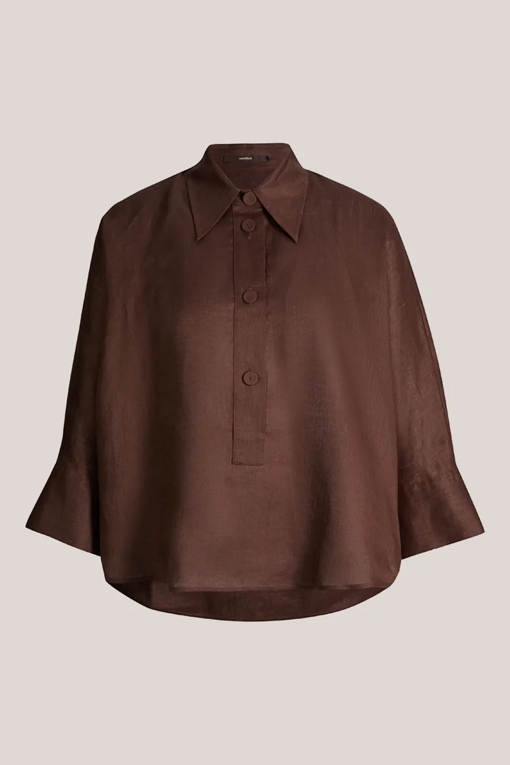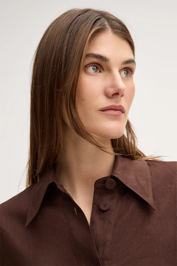 Leinen-Hemdbluse mit Umlegekragen in Dunkelbraun
