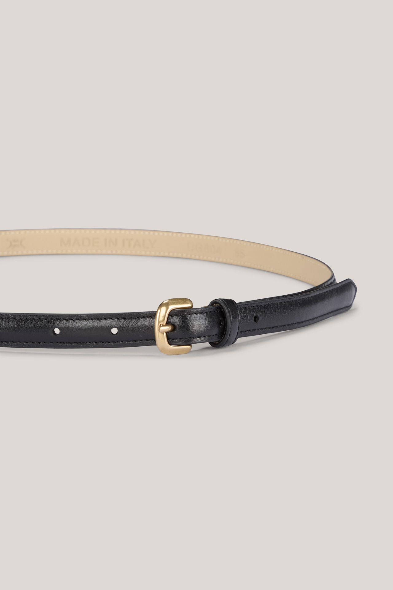 Der Ledergürtel besticht durch ein schlankes Design und die elegante Goldtone-Schnalle. Feine Nähte, die klassische Lochung und eine abgerundete Spitze verleihen stilvolle Akzente. Für einen Eyecatcher sorgt die Mini-Bag mit Druckknopf im Portemonnaie Stil.