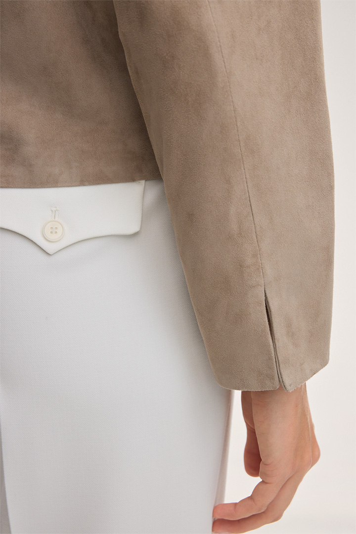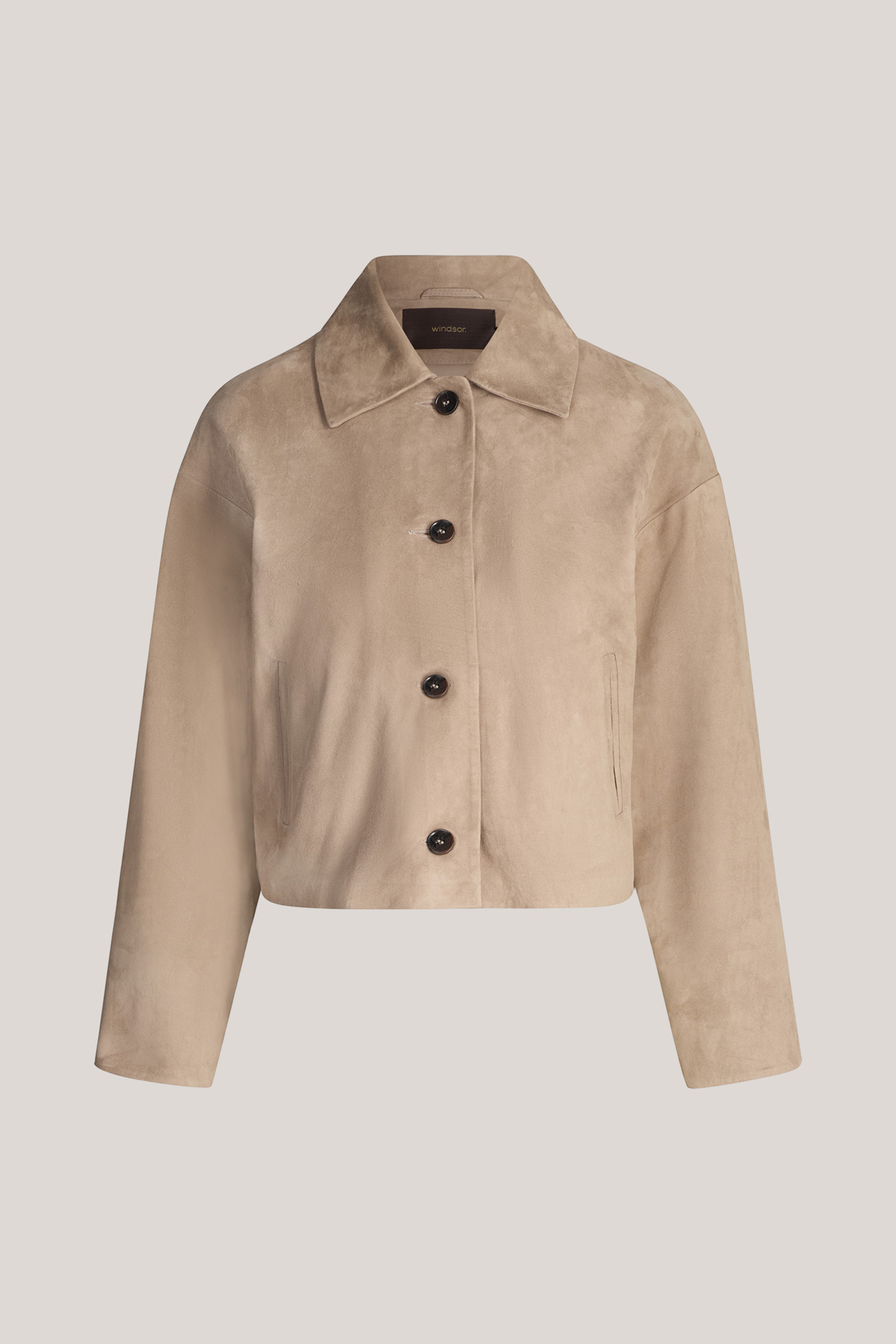Pures Lammveloursleder zeichnet die Hemdjacke als stilvolles Upgrade des Outfits aus – perfekt für moderne Freizeitstylings. Das Design heben der klassische Kragen und Knöpfe hervor, ergänzt durch geschlitzte Ärmelabschlüsse. Für ein stimmiges Finish sorgen seitliche Leistentaschen.