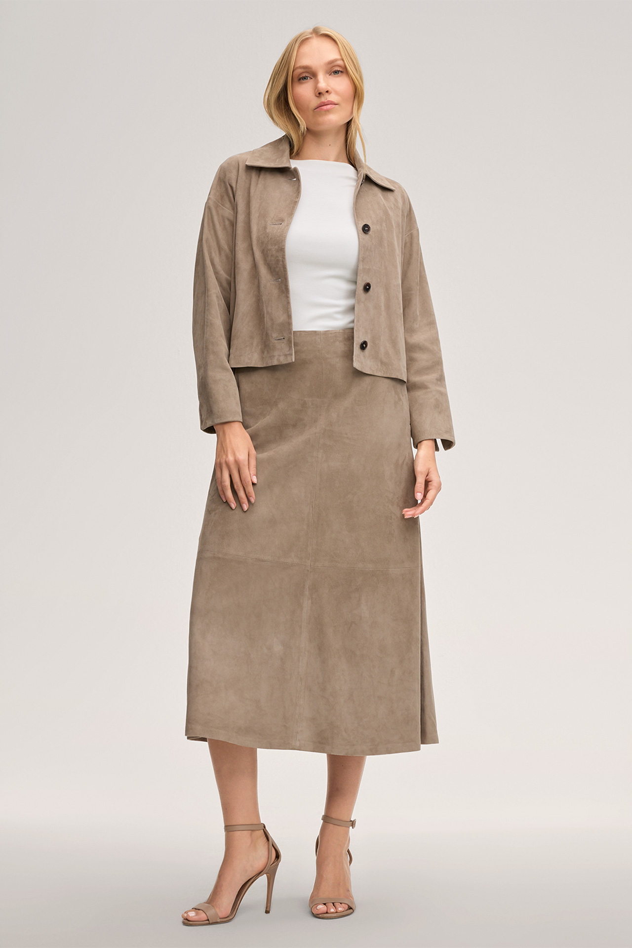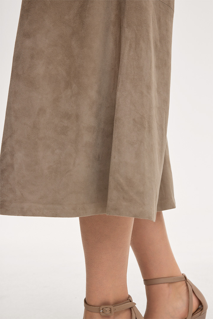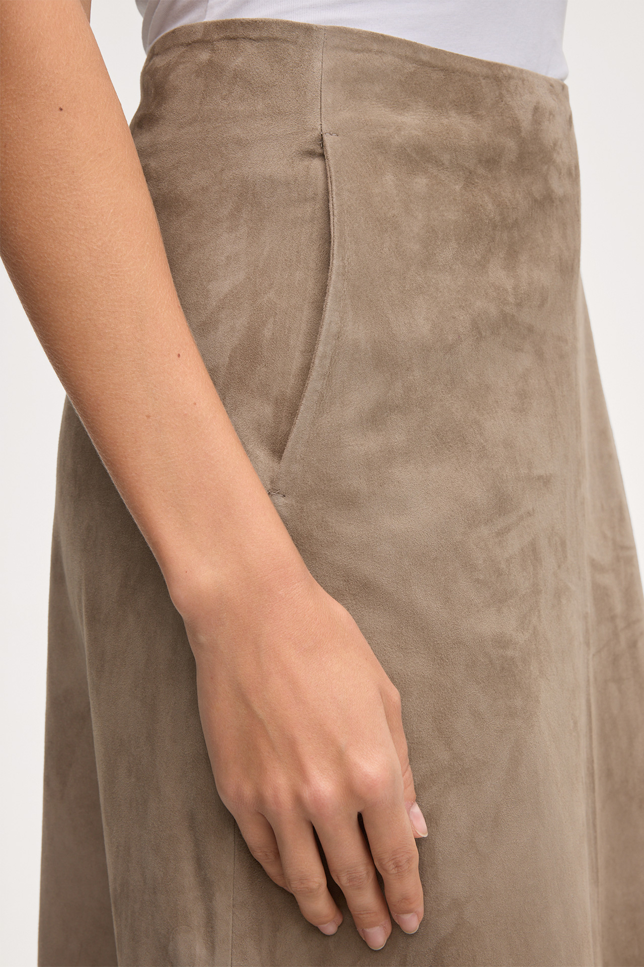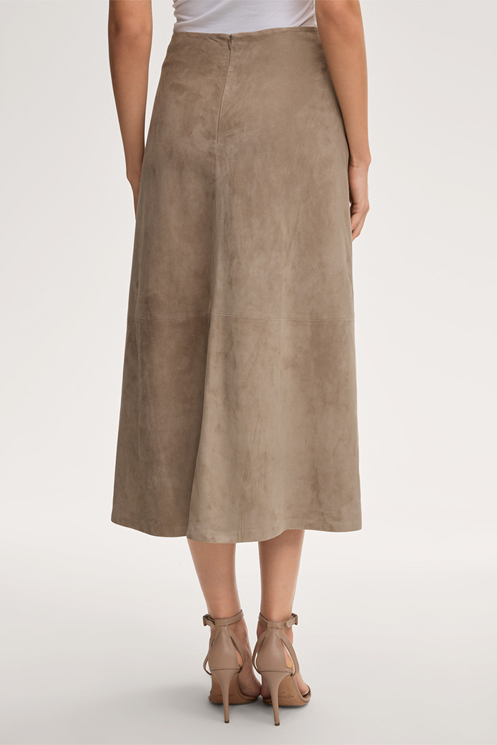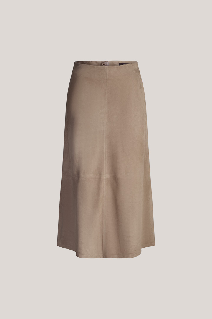 Lammvelours-Leder-Rock in Midi-Länge in Taupe