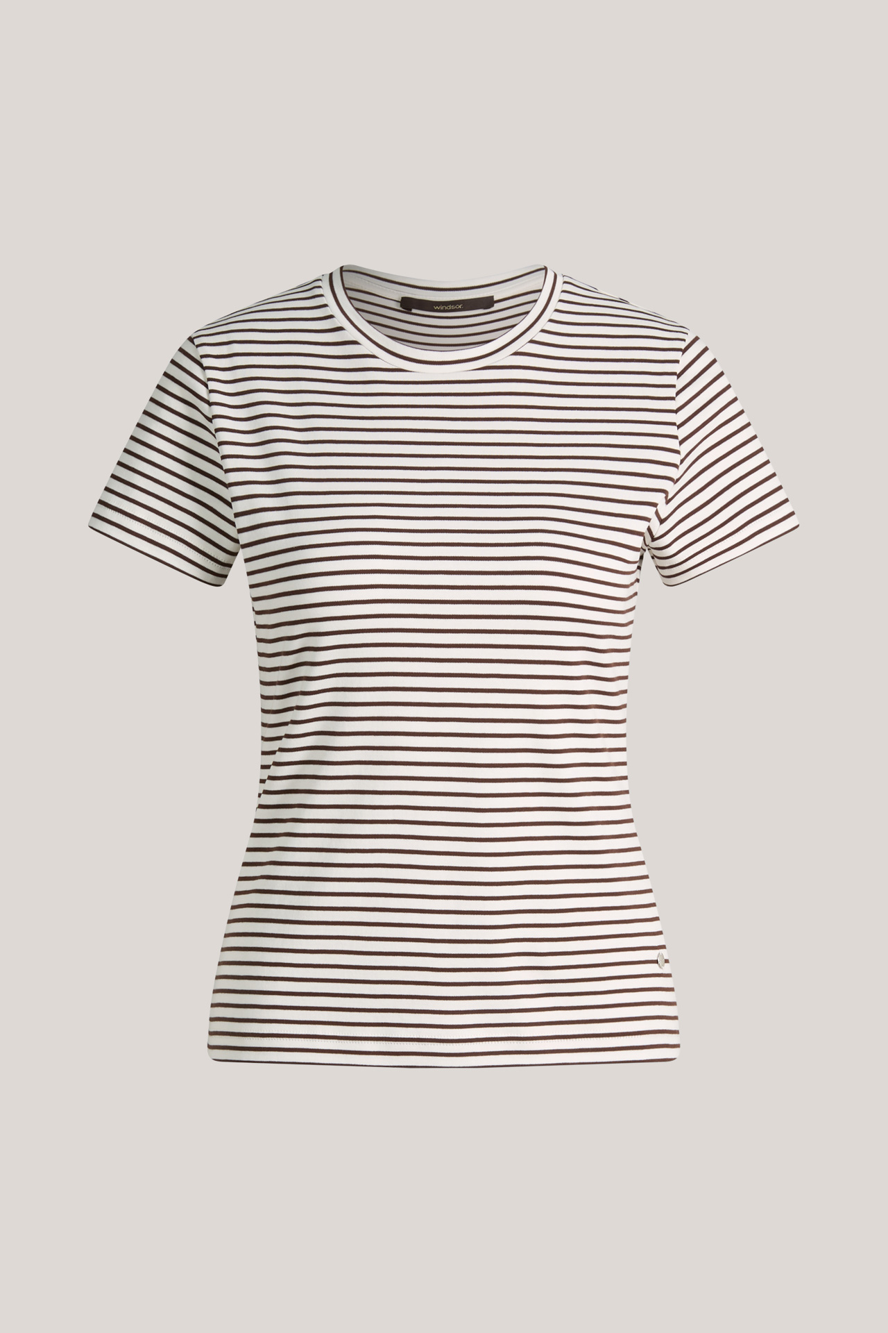 Mit klassischem Rundhalsausschnitt, kurzen Ärmeln und doppelt vernähten Abschlüssen überzeugt das T-Shirt als vielseitiger Allrounder. Die gestreifte Optik verleiht einen modernen Touch, ergänzt durch eine applizierte Logo-Plakette am Saum. Das Essential passt zu Röcken, Jeans und Leinenhosen. Reiner Baumwolljersey bietet puren Tragekomfort.
