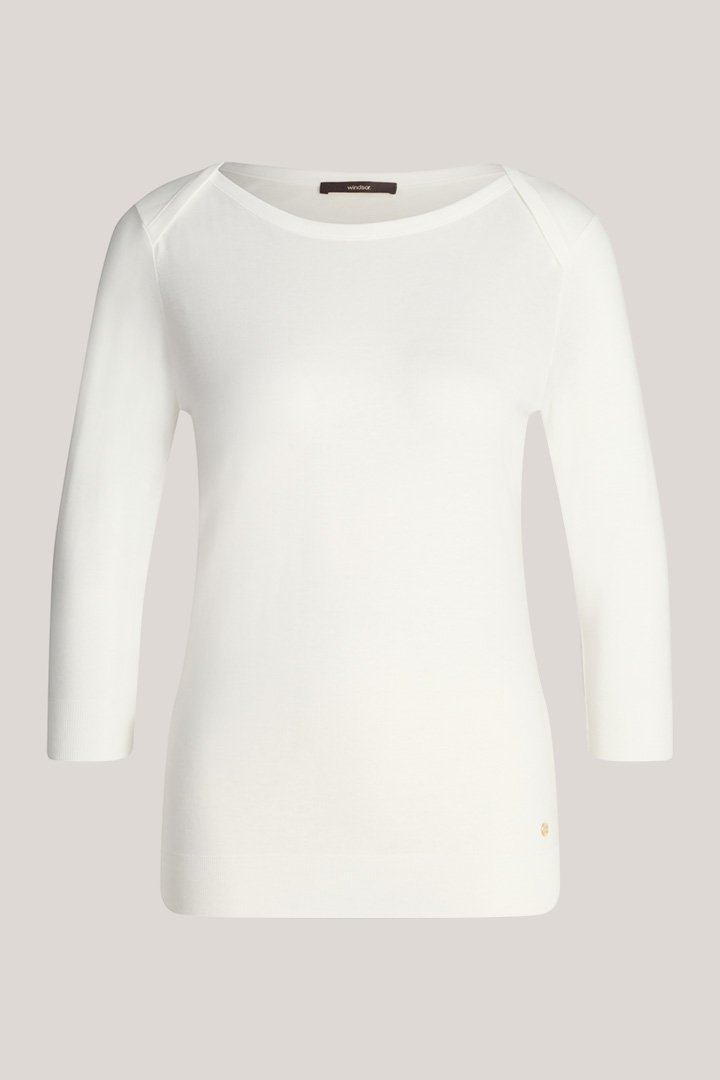 Das Shirt überzeugt aus einer Mischung aus Lyocell und Baumwolle als komfortabler Allrounder für vielseitige Outfitkreationen. Für den modernen Look sorgen Dreiviertelärmel und der U-Boot-Ausschnitt, ergänzt durch gerippte Bündchen. Einen markentypischen Akzent setzt das metallisierte Labeldetail.