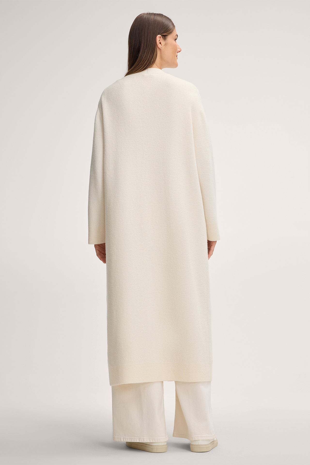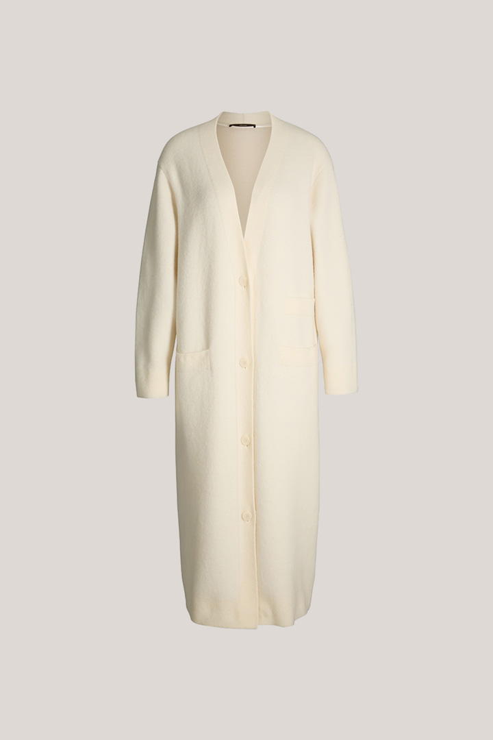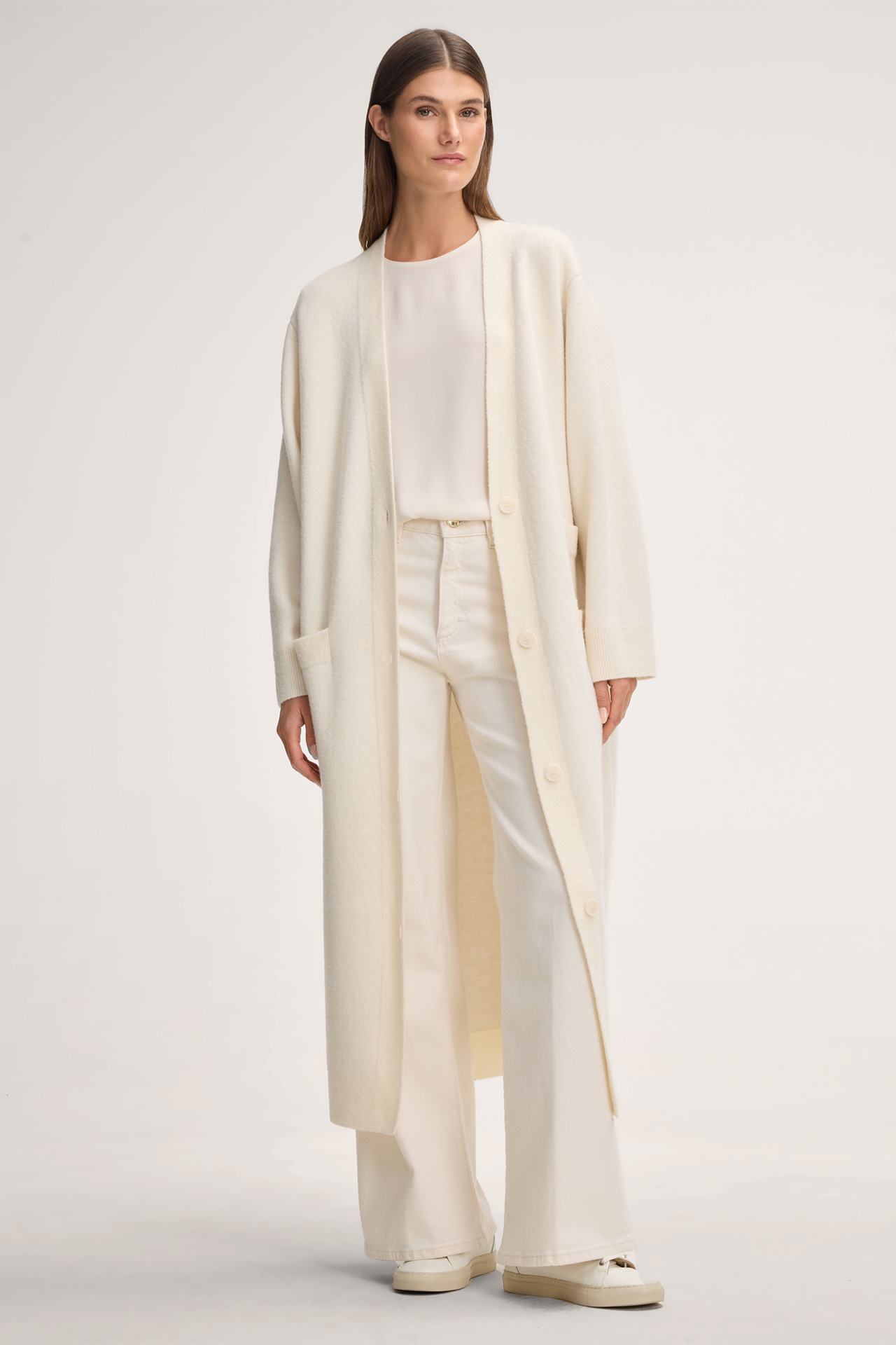 Der lange Cardigan überzeugt in stretchiger Schurwollmischung als stilvolles Update verschiedener Layering-Stylings. Klassische Details wie der V-Ausschnitt und die durchgehende Knopfleiste heben das Deisgn hervor, stimmig ergänzt durch Leistentaschen. Überschnittene Schultern und gerippte Bündchen verleihen ein komfortables Finish.
