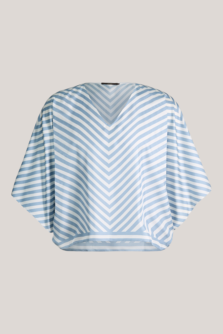 Perfect for summer and elegant holiday looks, this feminine poncho-style blouse offers versatile styling options. It can be paired with gabardine Bermuda shorts and flowing trousers in a mix of styles. The V-neck and batwing sleeves give the shirt natural refinement.