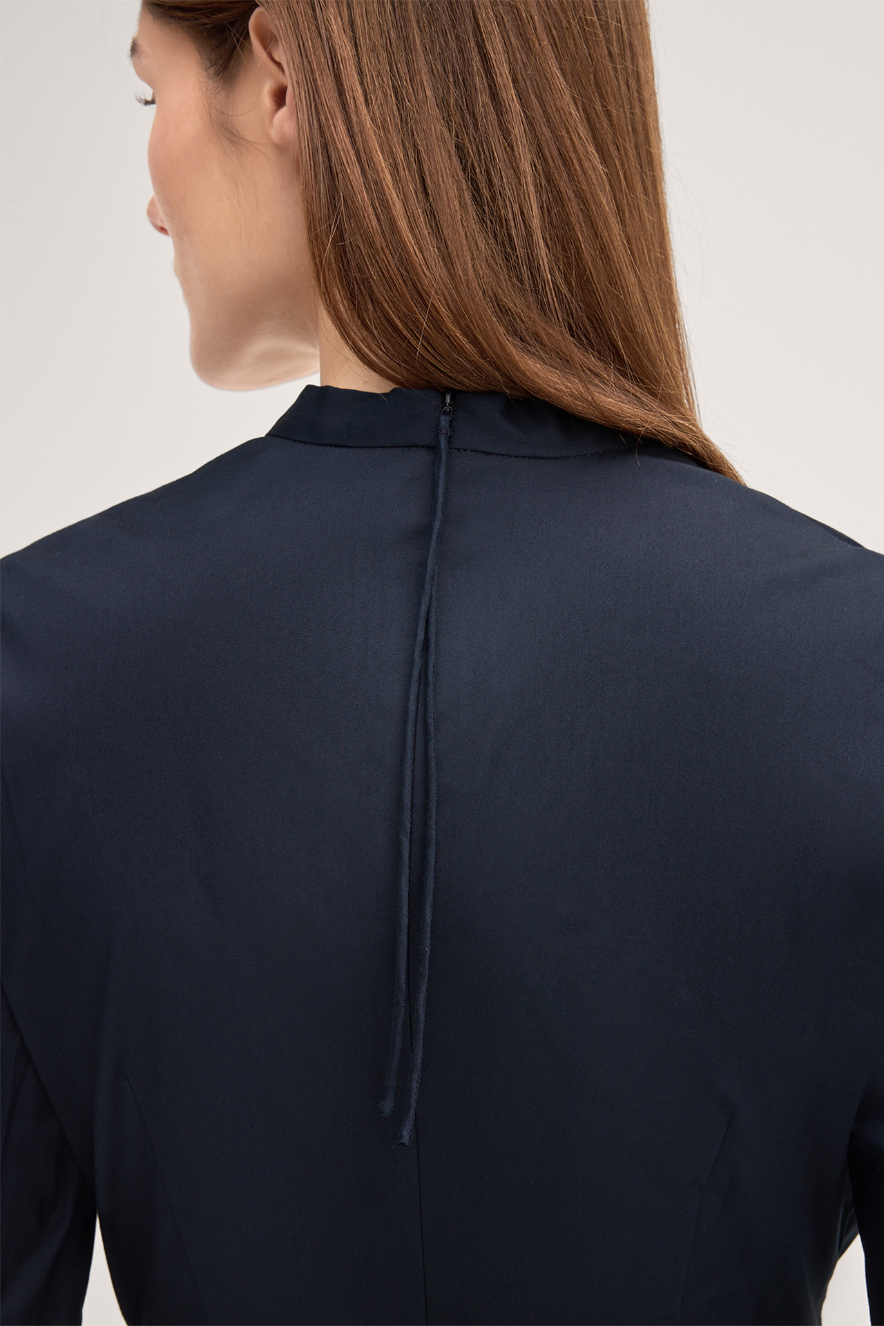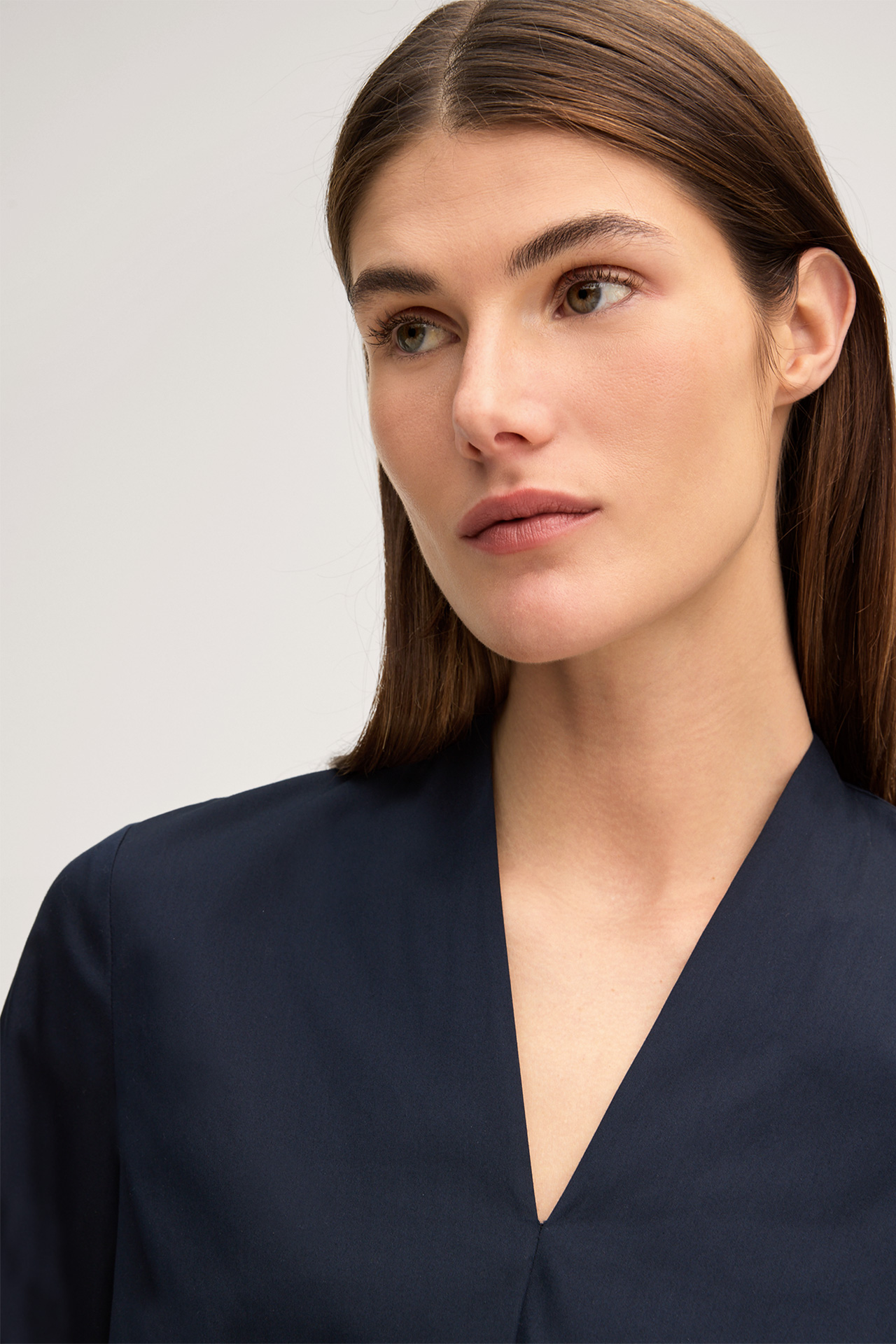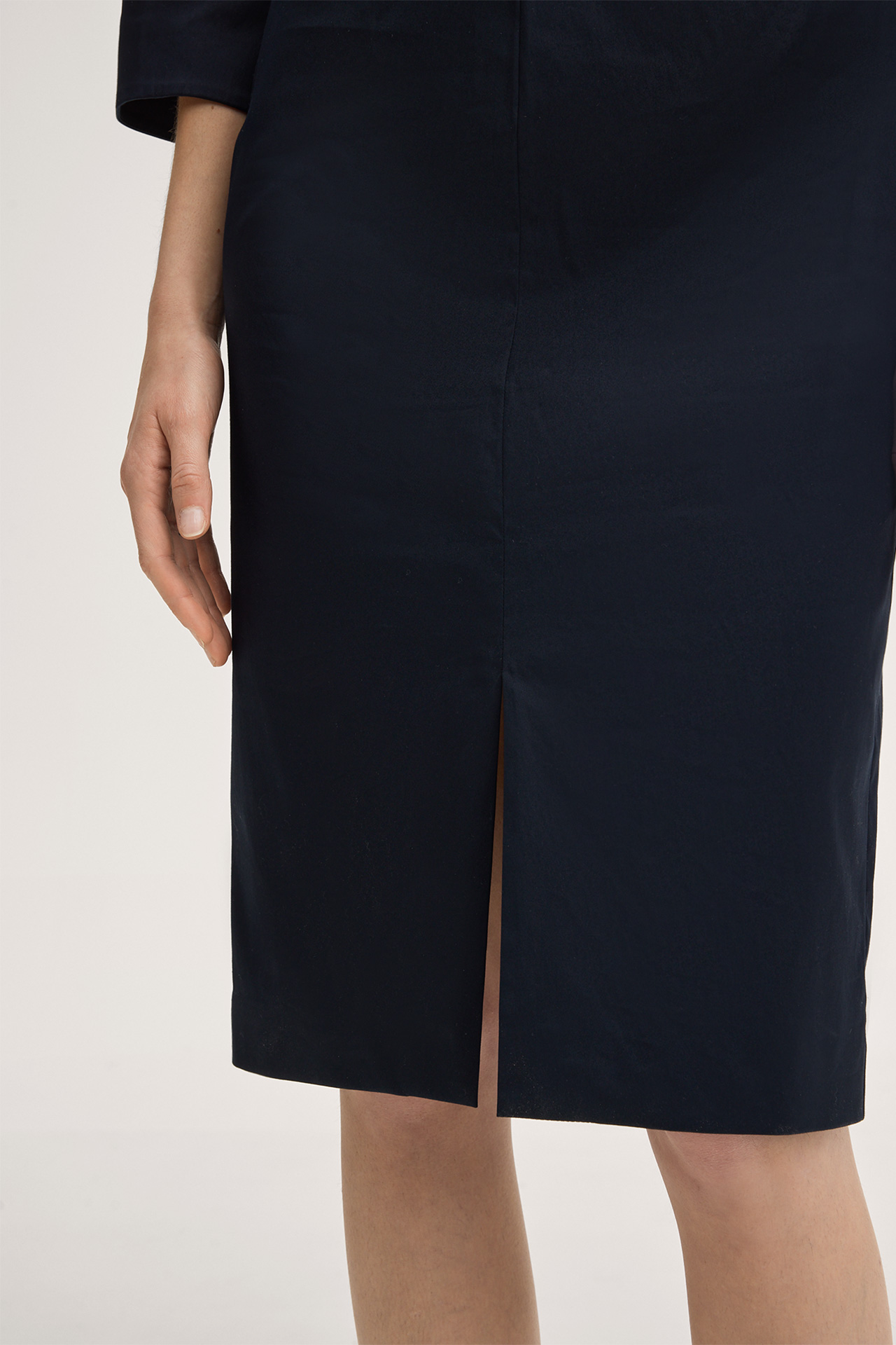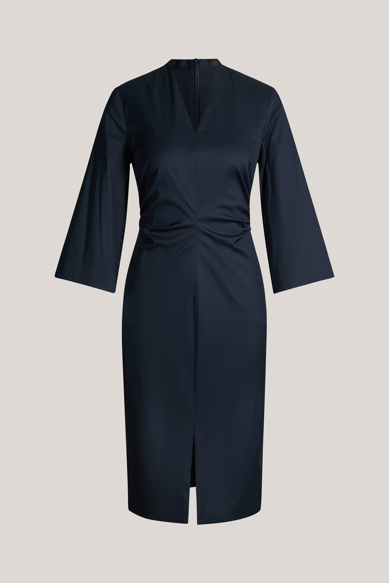 This feminine dress captivates with its flattering, figure-hugging silhouette in midi length. Sophisticated accents are given by the V-neckline, the slightly gathered waist and the front slit, completed by modern cropped sleeves. The stretch cotton fabric and rear zip fastening ensure pure comfort. This essential piece is suitable for formal occasions, business meetings and events.