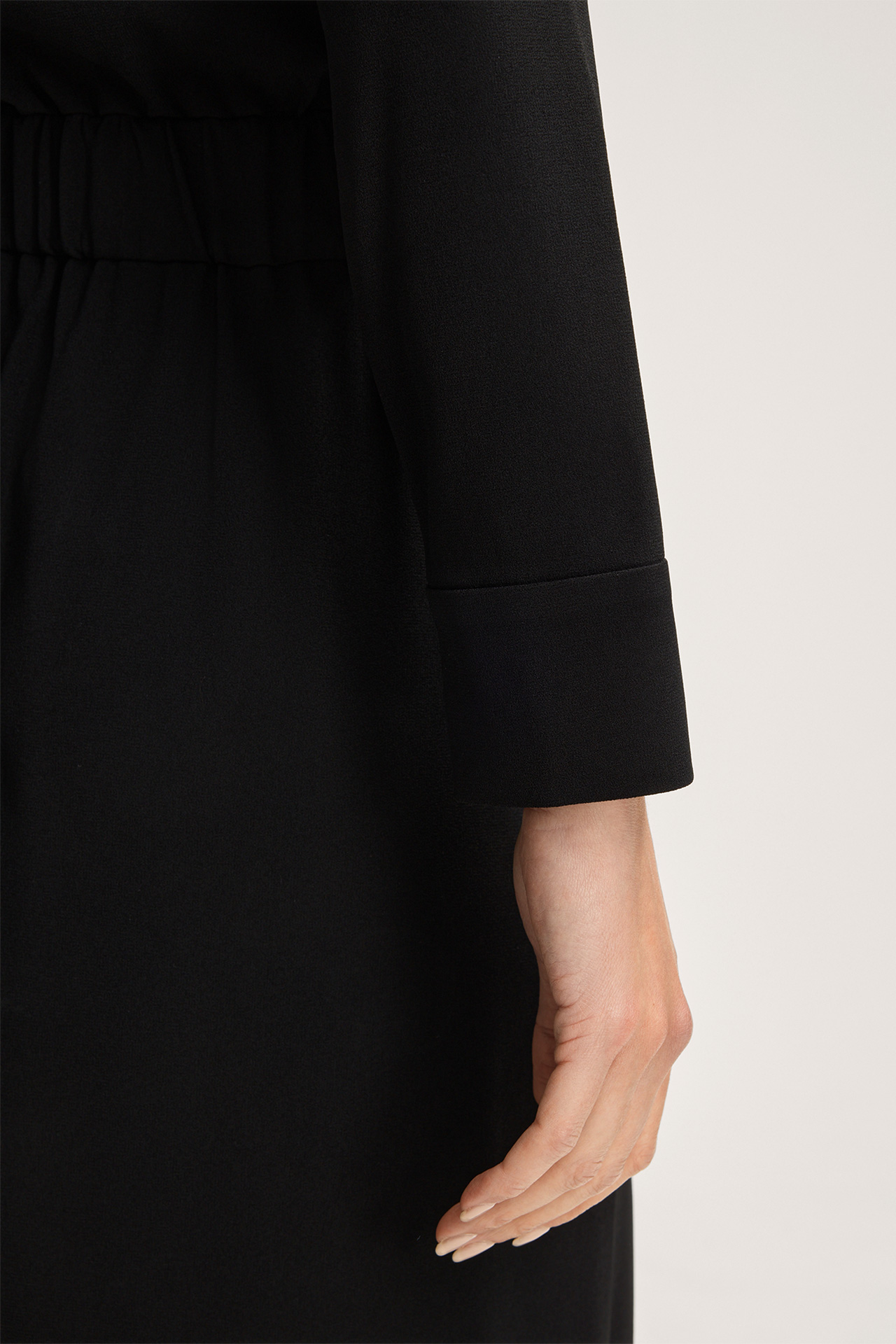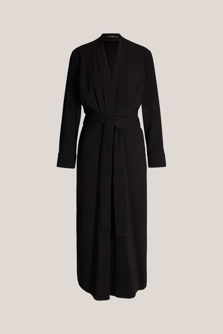 The dress stands out as a feminine all-rounder thanks to its pleated design and tie belt at the waist, complemented by a classic V-neck and inset cuffs. The crêpe quality lends a stylish finish.