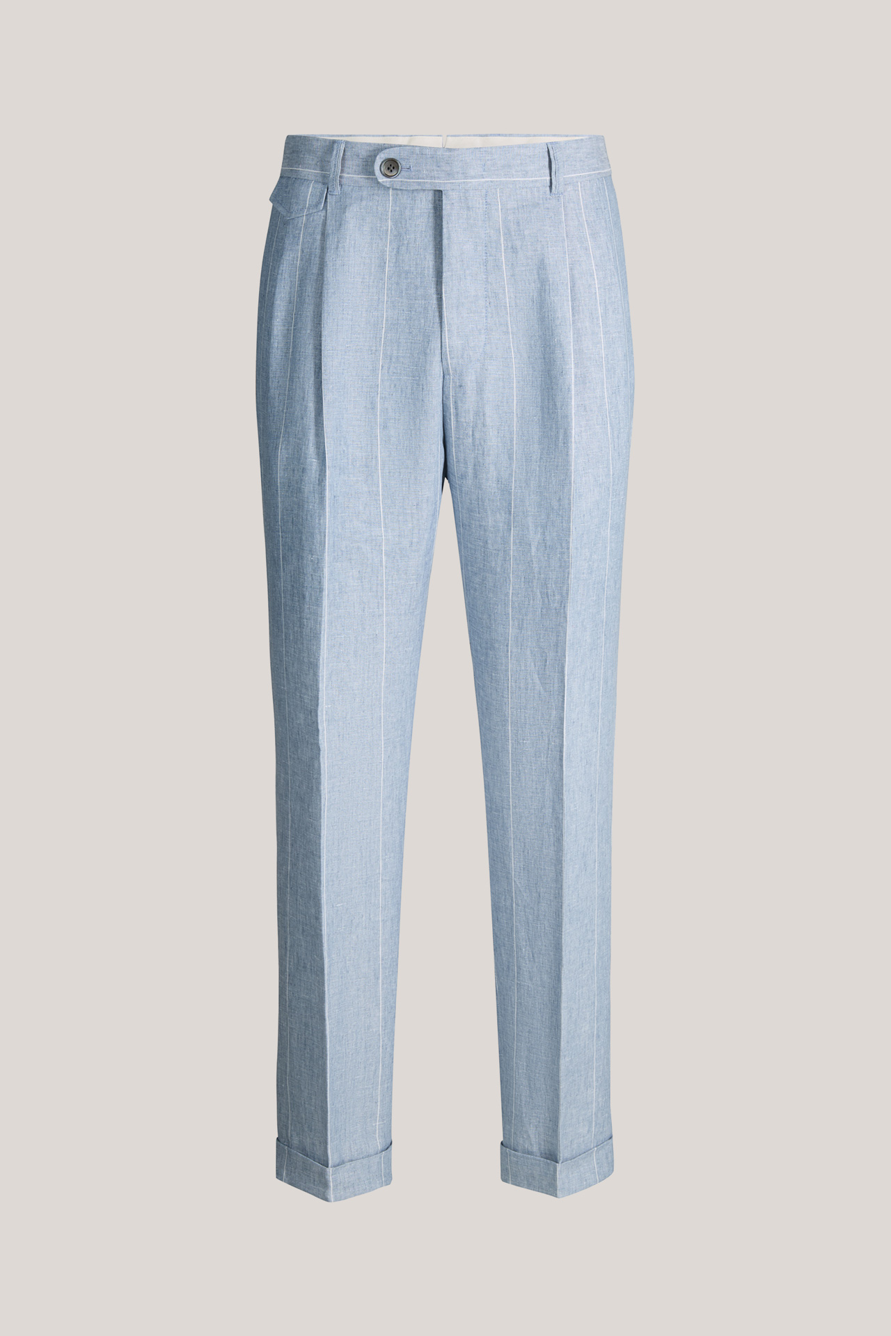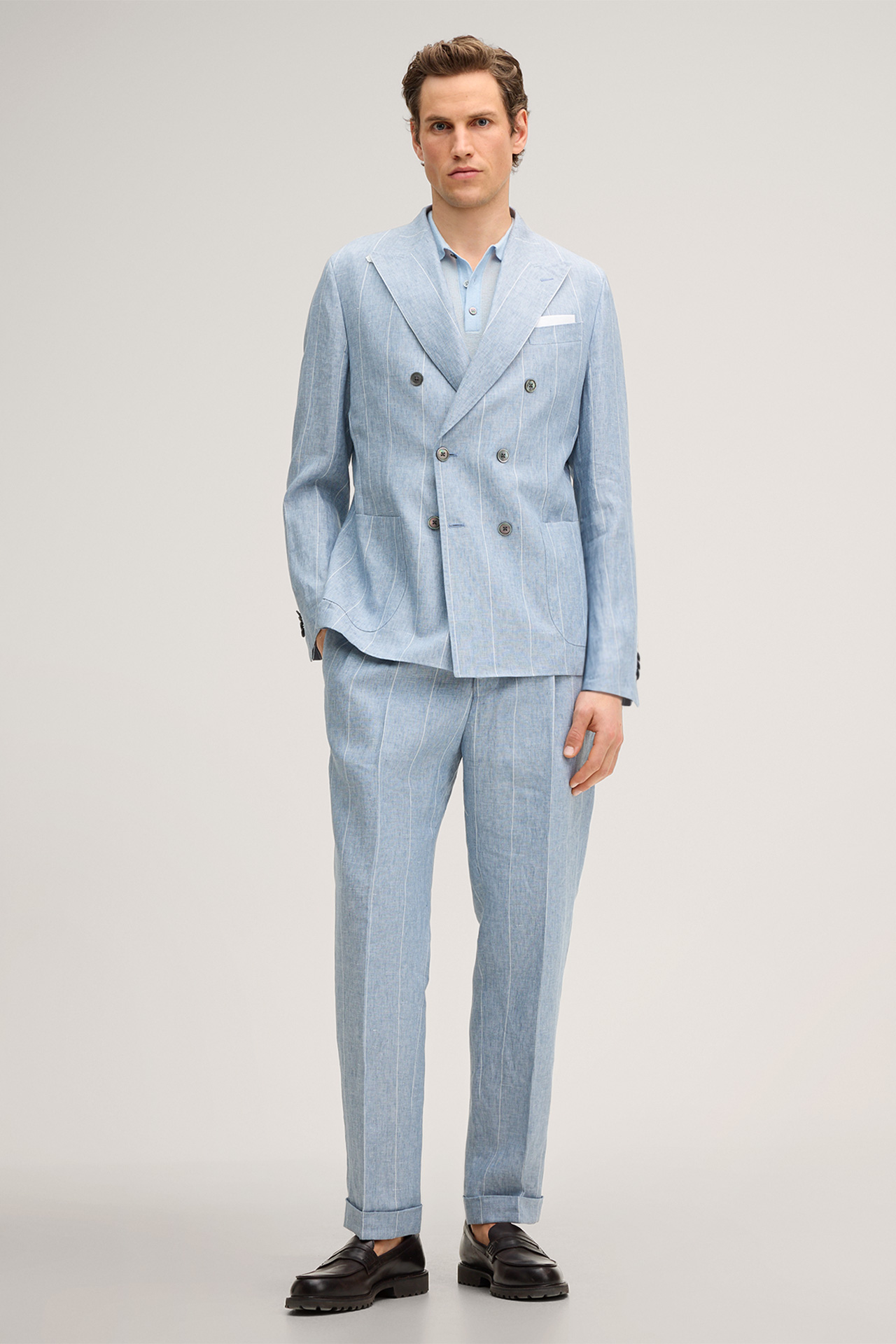 Refined pinstripes define the sophisticated design of the Sapo suit trousers. The pure linen fabric, completed by a partial lining, ensures comfort and ease of wear. Classical pleats, back welt pockets and the offset bar tab on the waistband with a combined button and zip fastening give distinctive accents. Hem cuffs and a small additional flap pocket add a relaxed touch. The matching jacket is the perfect choice for festive events.