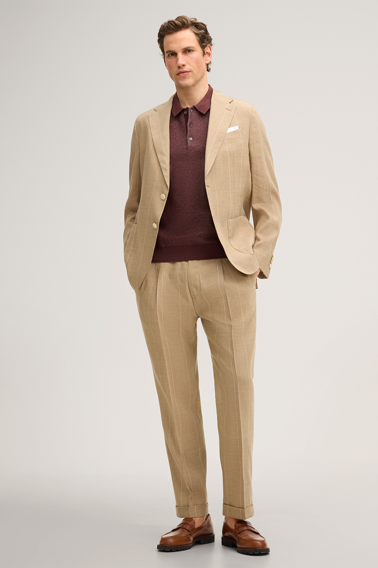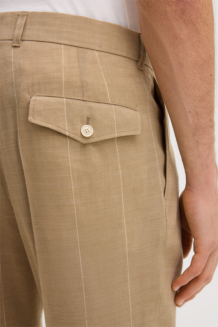 Sapo Modular Trousers with Pinstripes and Waist Pleats in a Virgin Wool Blend with Linen in Beige