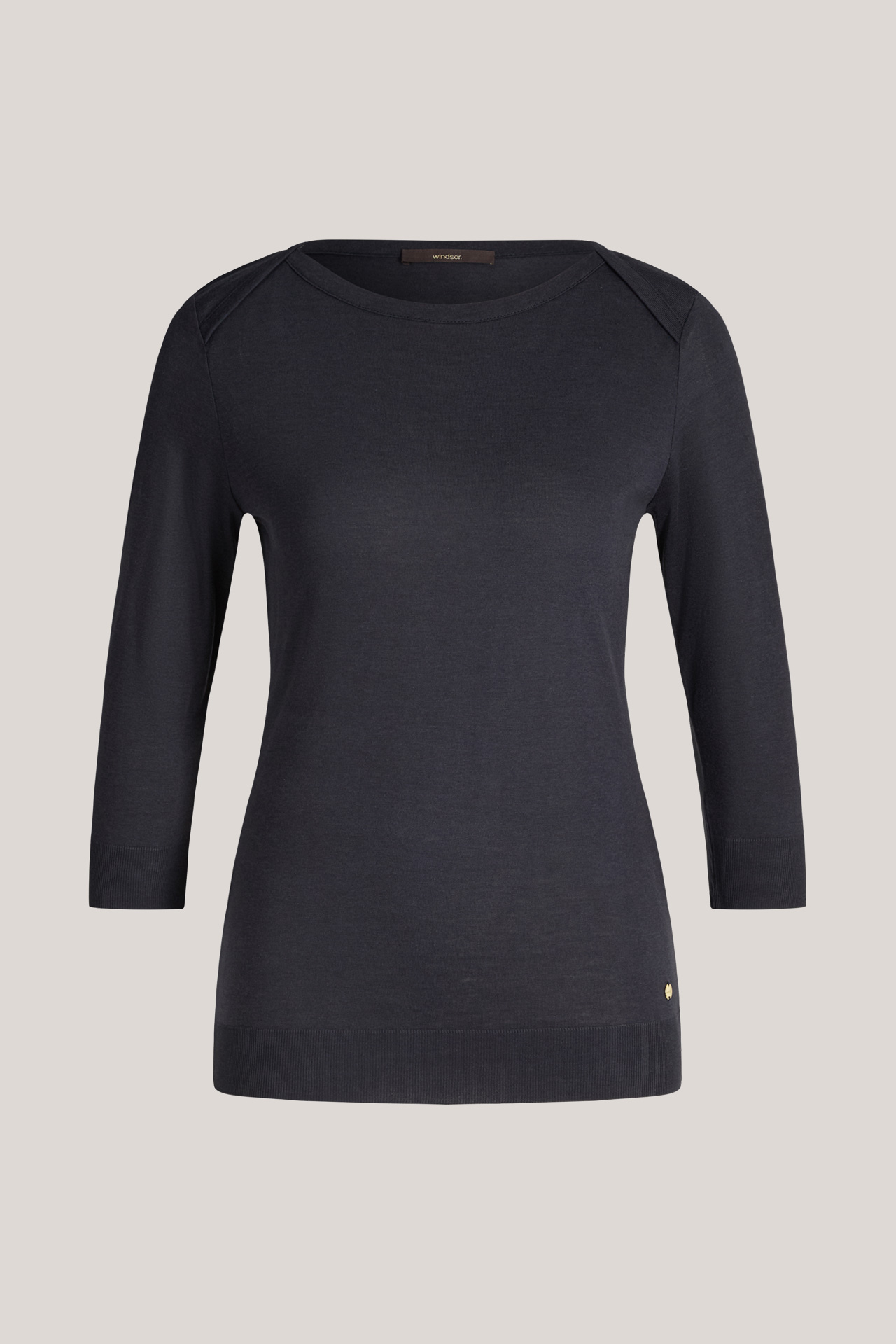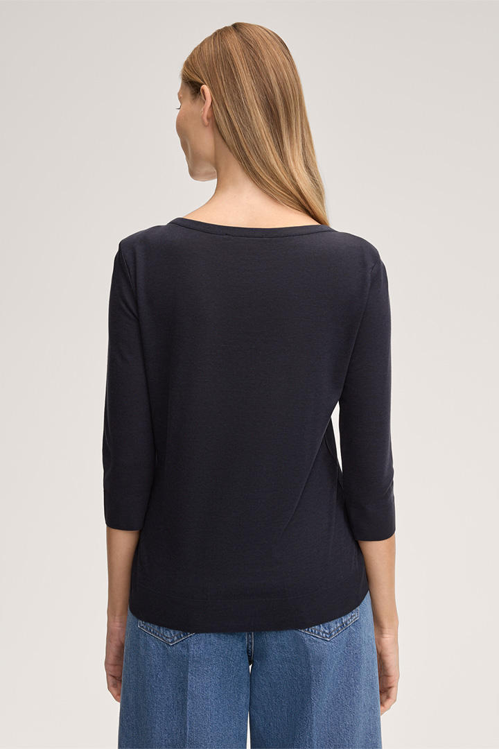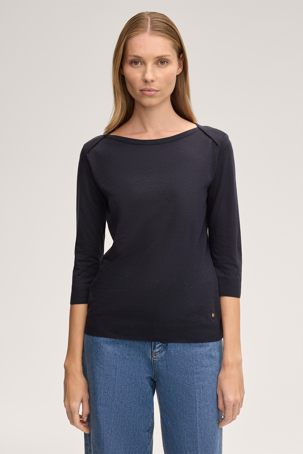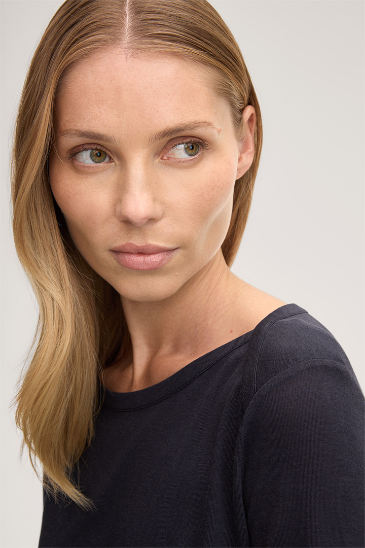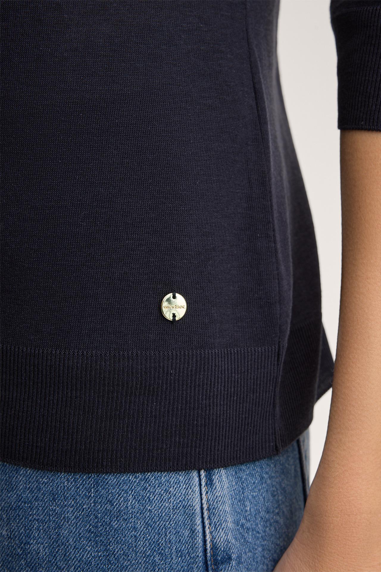 This shirt showcases a blend of lyocell and cotton, providing a comfortable all-rounder for versatile outfit creations. Three-quarter length sleeves and a boat neckline, complemented by ribbed cuffs, create a modern look. The metallic logo detail adds a signature brand accent.
