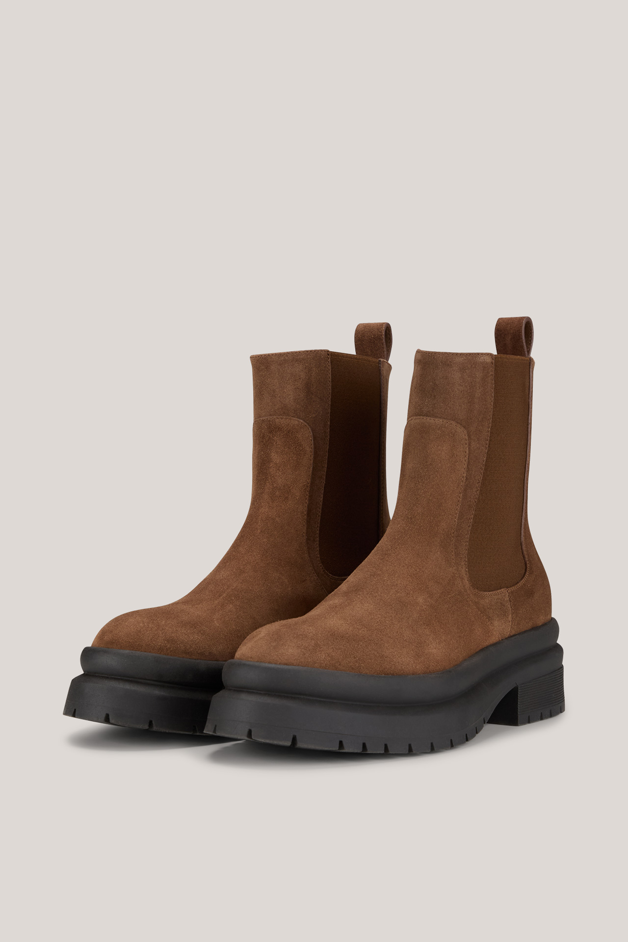 Stylish and versatile: Chelsea boots in suede with elegant accents. The shaft with elasticated side sections and the addition of a classic pull tab give these boots a comfortable finish. The modern profiled sole turns them into urban attention-getters.