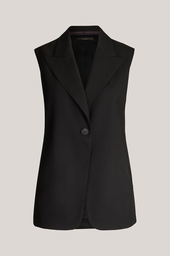 Un modèle au look affirmé : la veste sans manches en pure laine vierge dotée d’un col à revers et d’une élégante fermeture à bouton unique. Les fentes de mouvement au dos apportent une touche finale confortable à sa silhouette ajustée. Ce modèle polyvalent est idéal pour créer des tenues business classiques, mais aussi parfait comme pièce forte d’une tenue avec un jean et un chemisier.