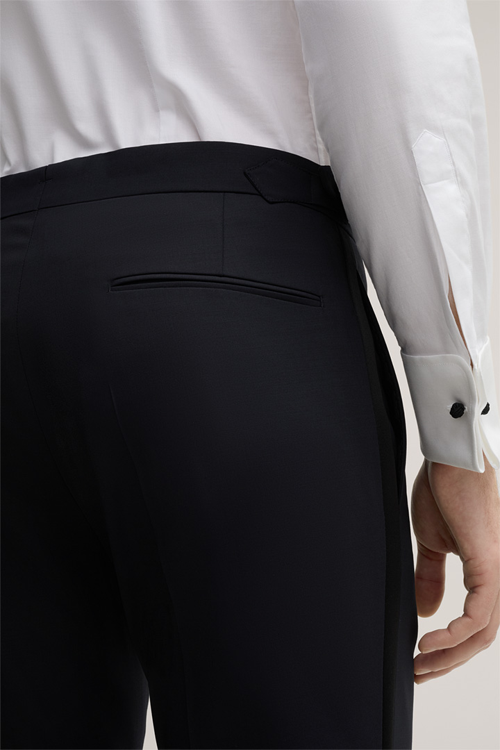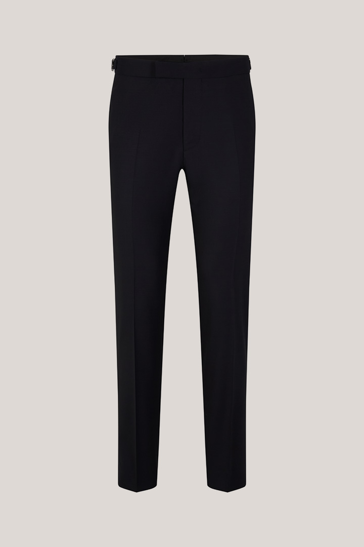 Un modèle distinctif pour les occasions festives : le pantalon de smoking Turo agrémenté de bandes de smoking contrastantes effet satin. Ce modèle est doté de boucles métalliques à la taille qui lui confèrent une touche finale moderne, tandis que les poches arrière classiques et les surpiqûres rehaussent son design élégant. Le tissu de laine vierge mélangée offre un agréable confort.