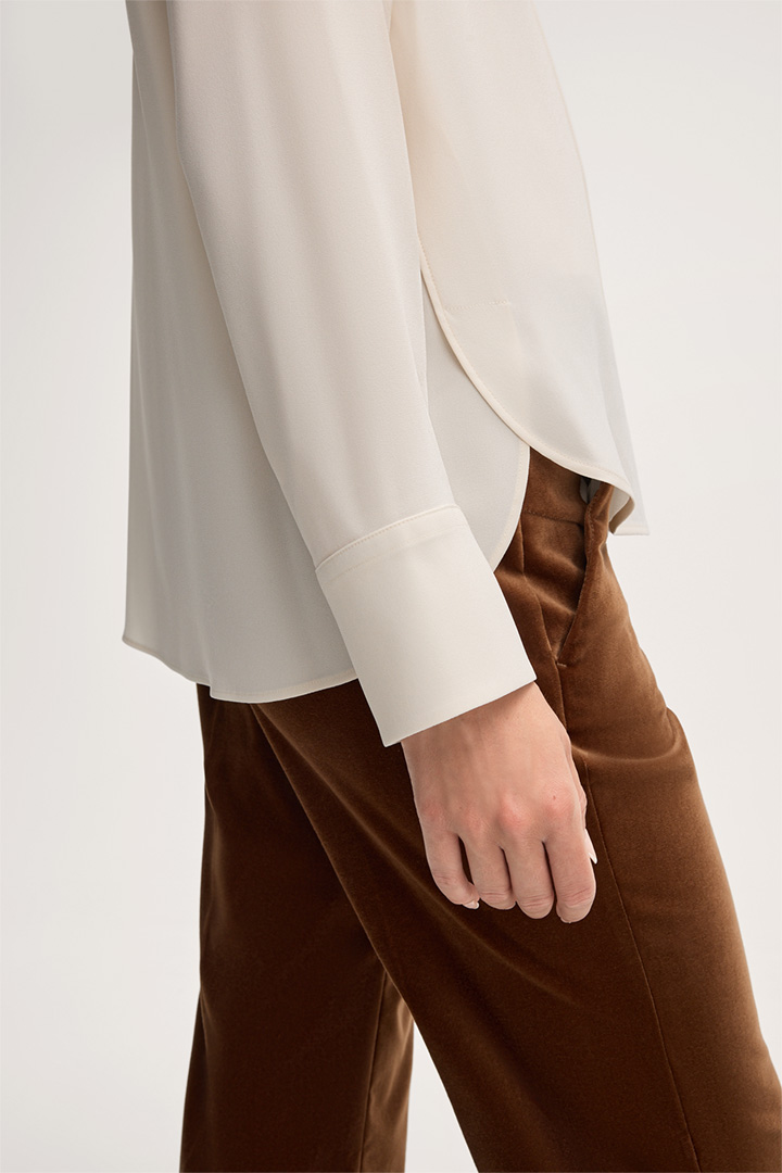 This blouse excels as a stylish piece with its classic shirt-style collar and concealed button placket. The slightly dropped shoulders and loose silhouette ensure a modern twist. The hem with side slits adds a comfortable finish to the design.
