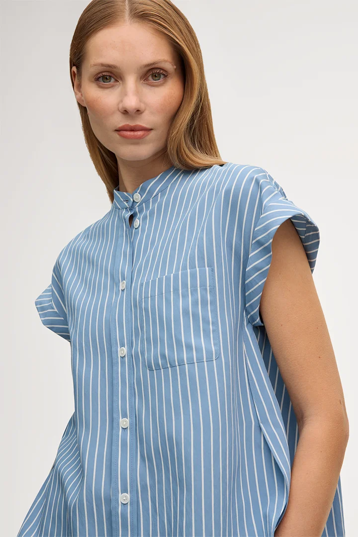 A classic for leisure styling with an elegant twist or for the business wardrobe, this viscose blend shirt blouse features a timeless striped design. Features such as the narrow stand-up collar and full-length button placket characterise the look, while fitted sleeves with fixed cuffs add a modern twist. The pocket at chest height adds a stylish accent. The rounded hem with side slits provides a harmonious finish.