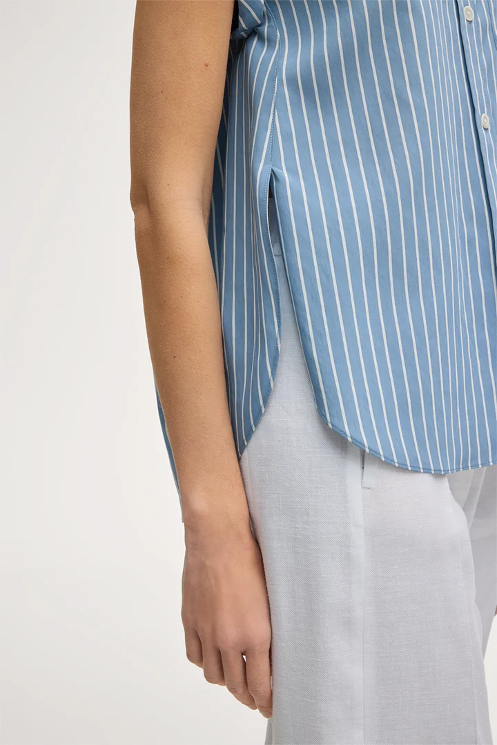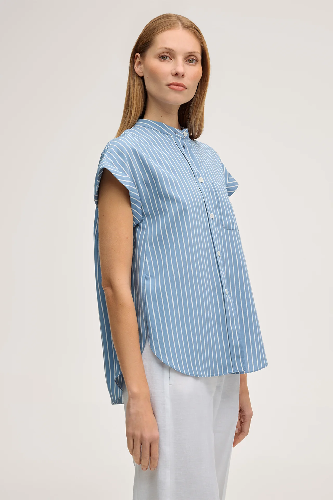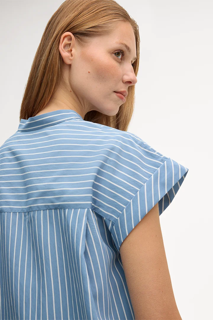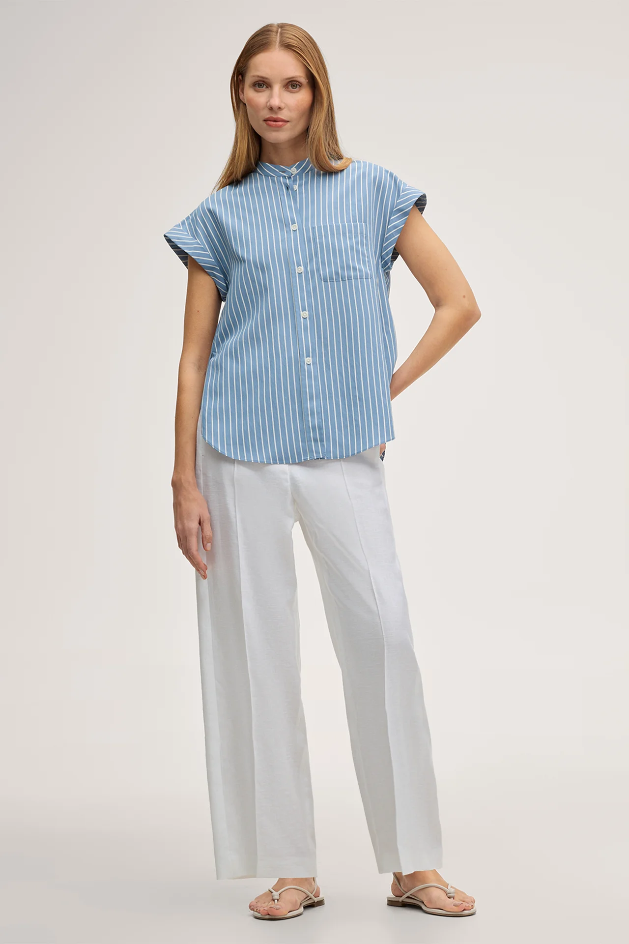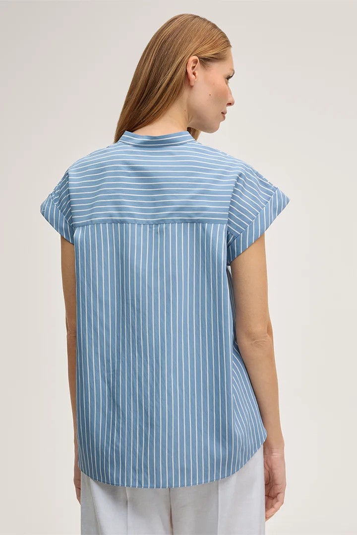 Viscose blend short-sleeved shirt blouse in light blue and ecru stripes