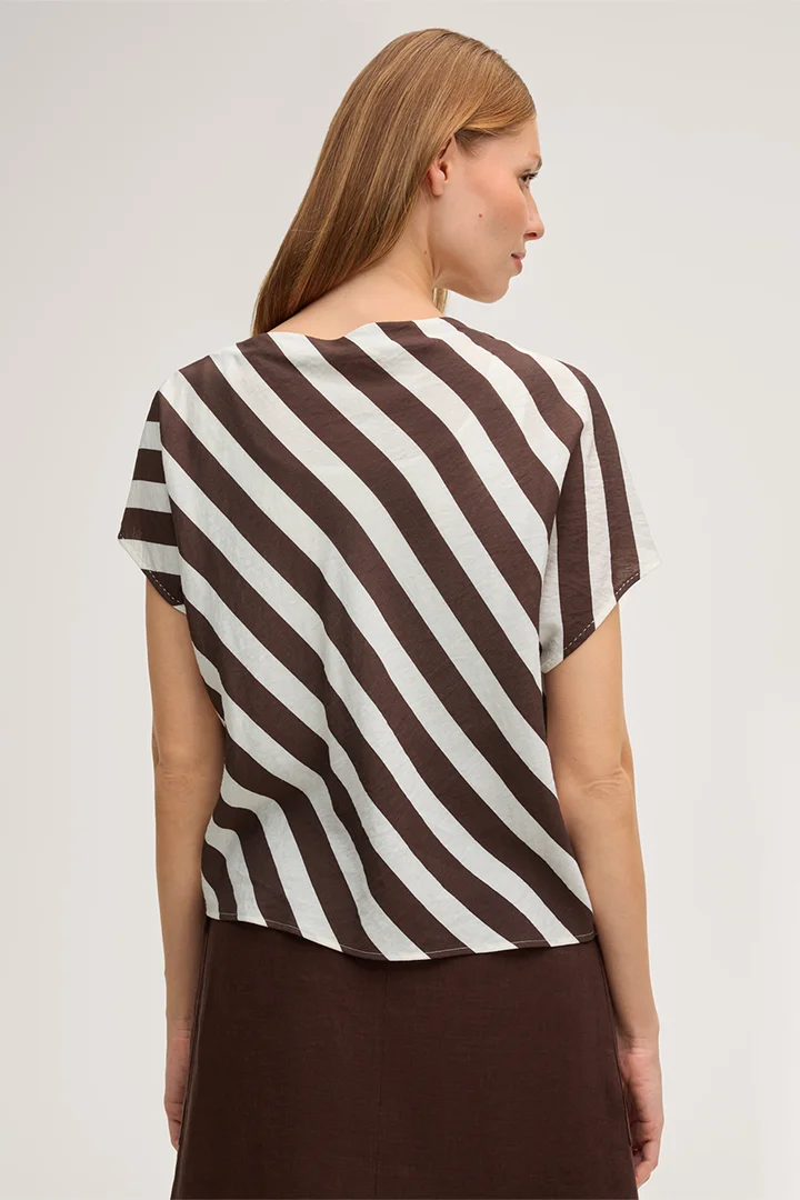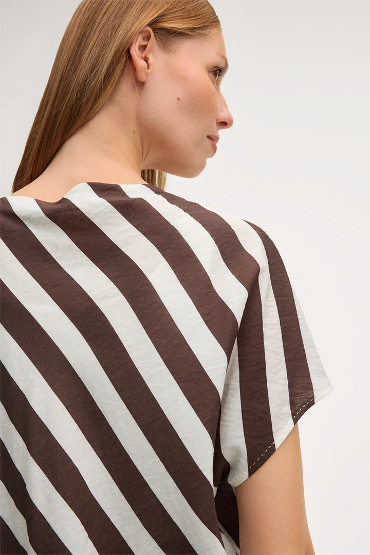 Viscose-linen blend blouse shirt in ecru and dark brown stripes