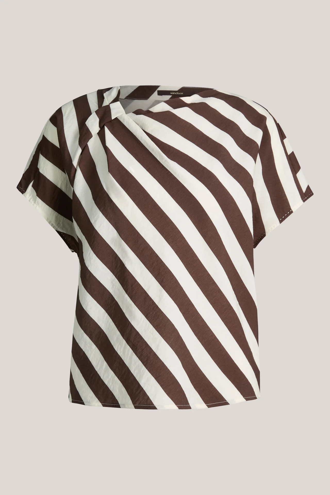 A viscose blend with linen gives this feminine blouse a high-quality feel, while block stripes and draping at the neckline emphasize its sophisticated elegance. Dropped shoulders and short sleeves provide a charming finish, rounded off by a refined hem. Paired with the matching skirt, this essential piece is perfect for events and occasions with summery flair.