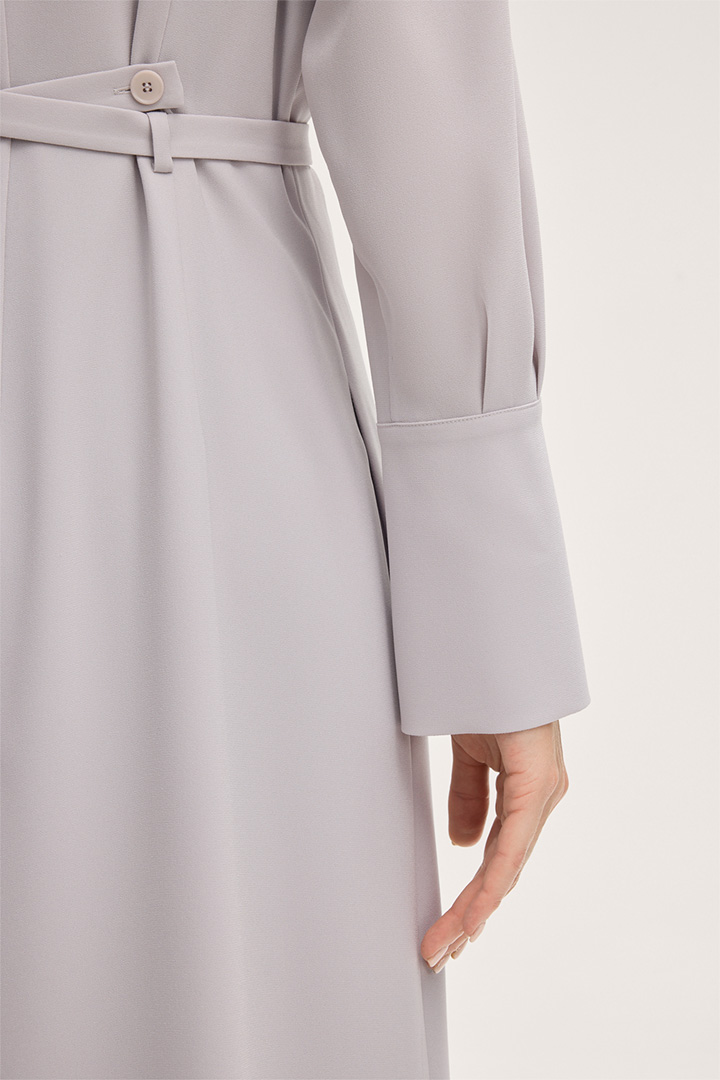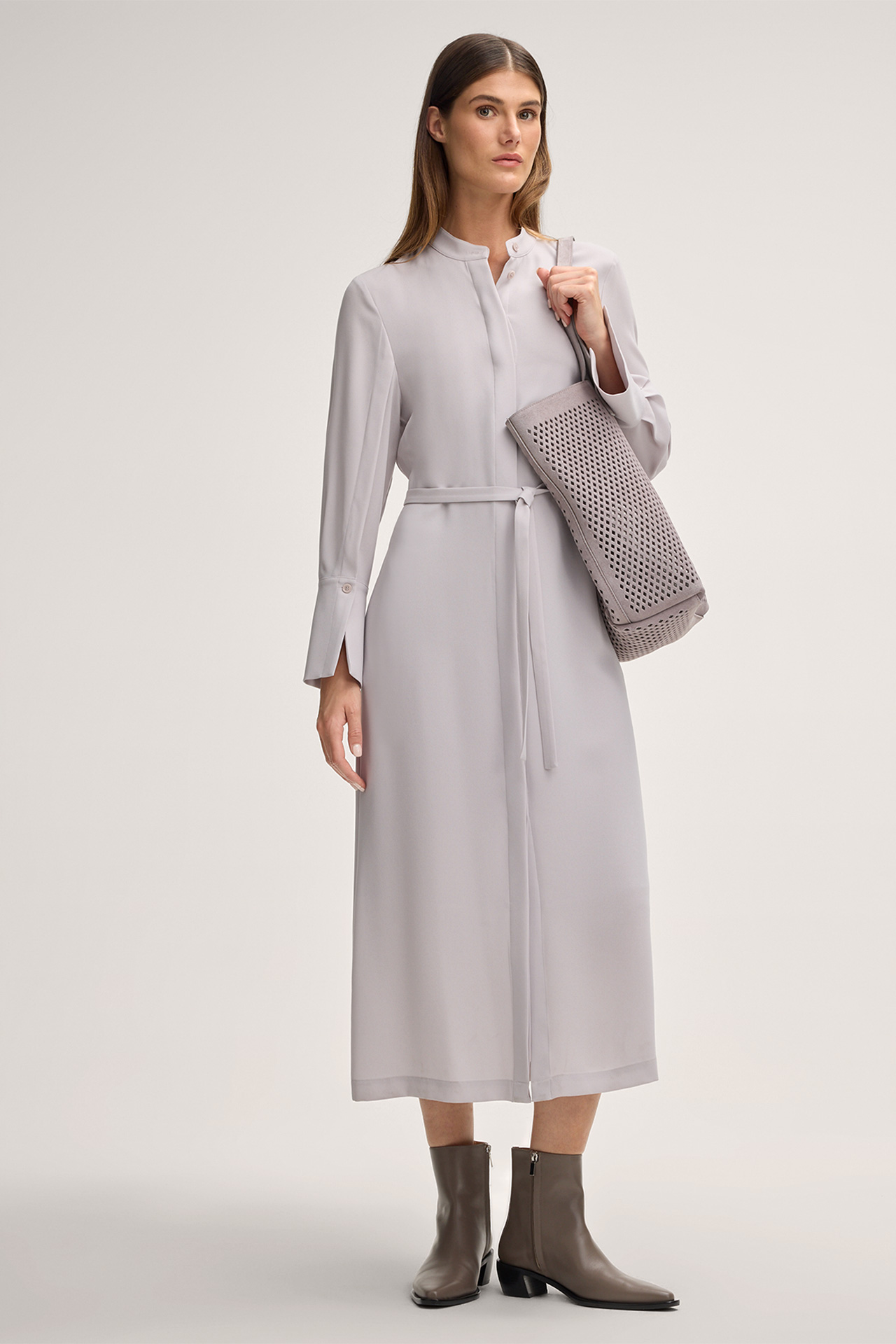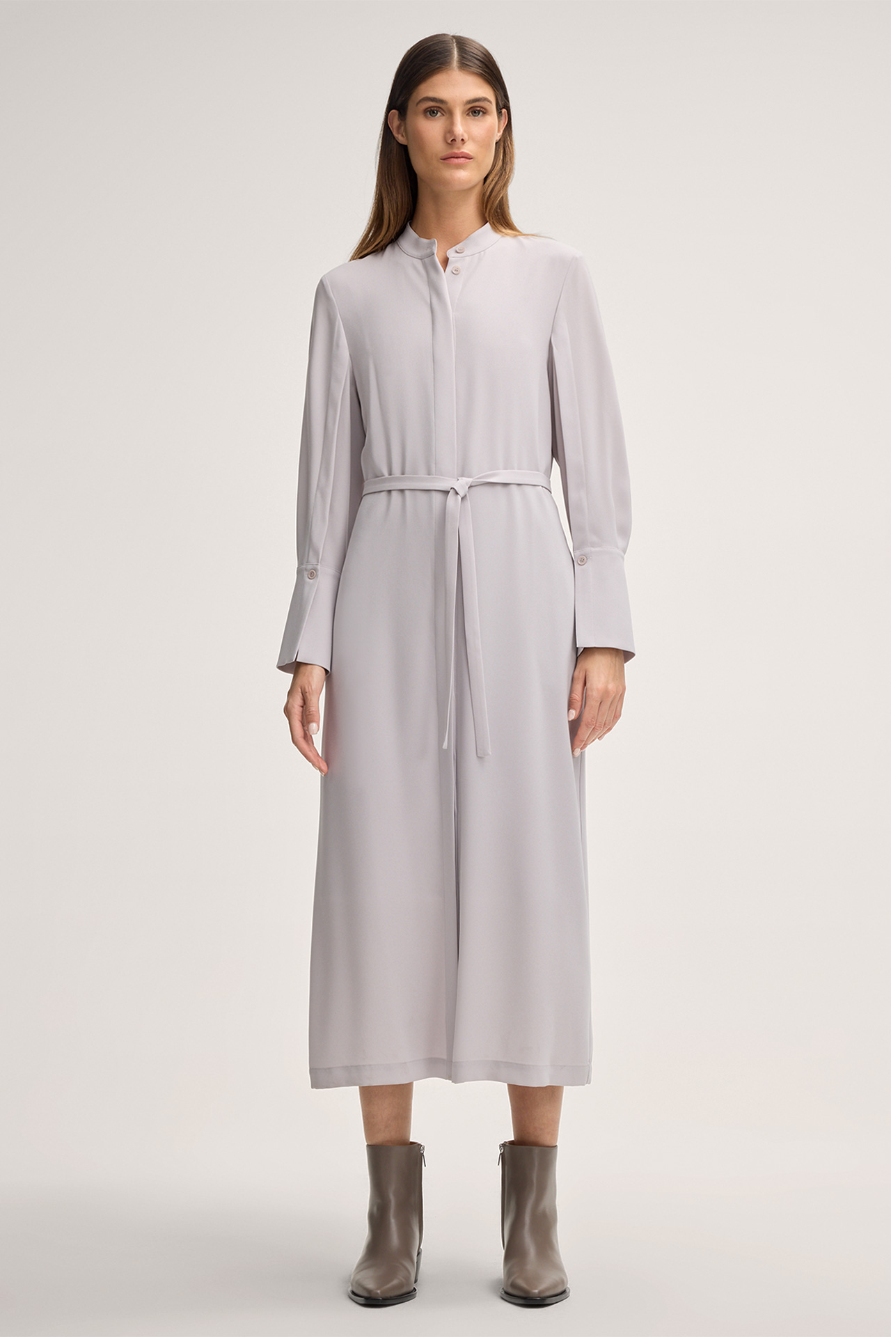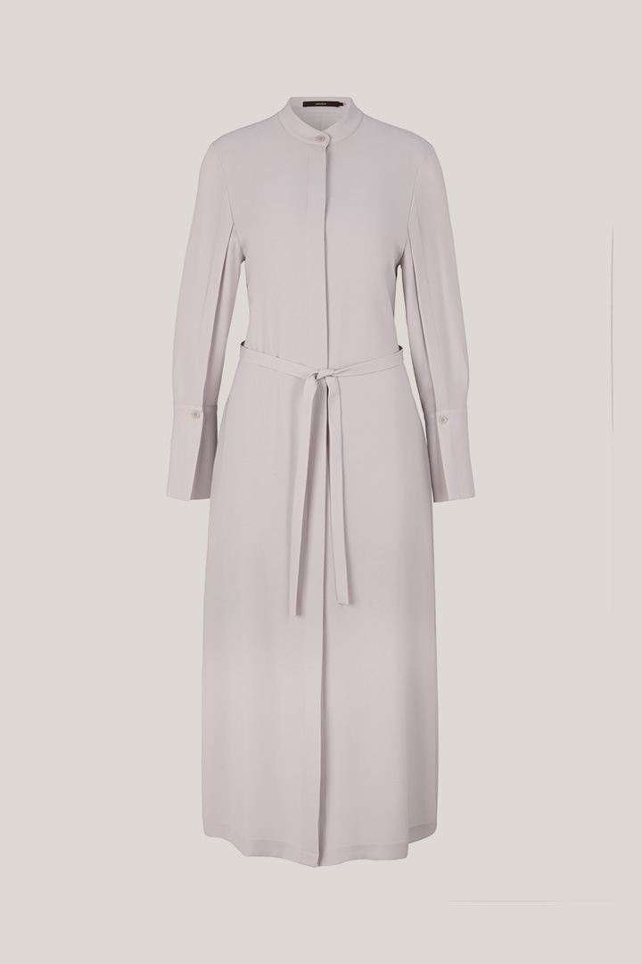 Sophisticated sleeves and the tie belt with button details at the back lend this crêpe midi dress an elegant twist, complemented by a narrow stand-up collar. Seam-concealed side slit pockets and a concealed button placket ensure a comfortable finish.