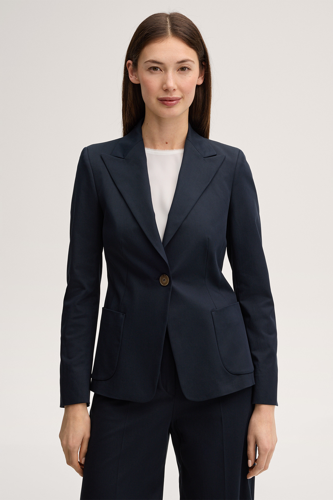 Ideal for business and formal occasions when paired with suit trousers or a matching skirt, this tailored blazer excels as a feminine style companion. The peak lapel and single-button fastening accentuate the look. Patch pockets add a confident modern touch. This essential is lightweight and comfortable thanks to the double-cotton stretch finish and proves to be timelessly stylish.