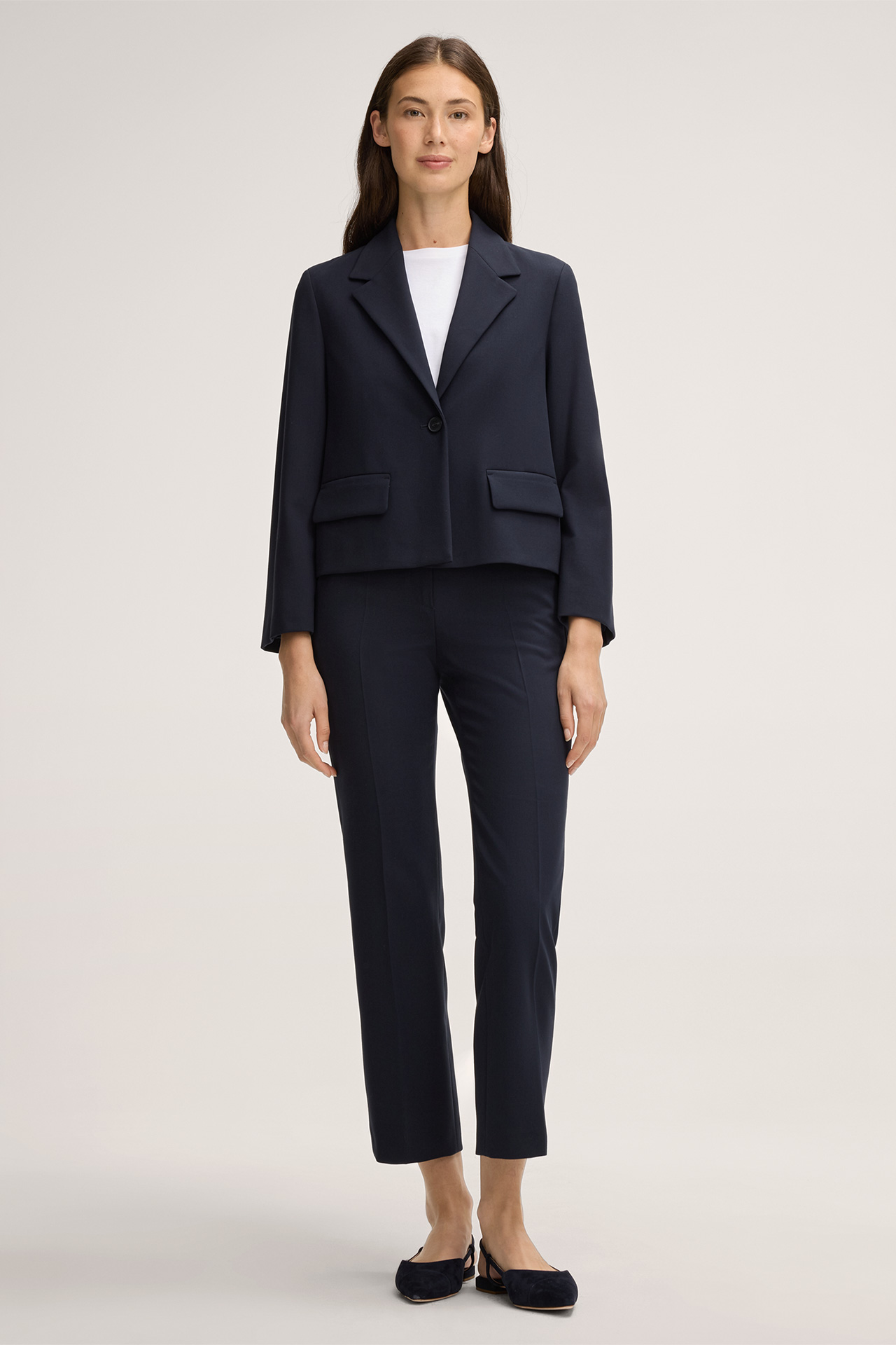 This blazer in crêpe quality made from a stretchy viscose blend is the perfect piece for elegant looks styled with the matching suit trousers. Details including the classic lapel and button fastening mark out the design, harmoniously complemented by flap pockets. Slits lend a comfortable finish to the piece.