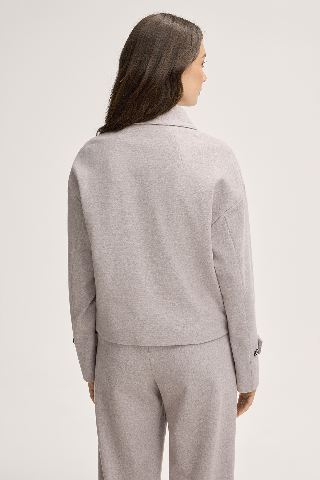 This short jersey blazer jacket with a slightly asymmetric front, concealed button placket and modern turn-down collar is sure to be a new favourite. Buttoned tabs on the sleeves and fine decorative stitching complement the look. Side slit pockets ensure a stylish finish.