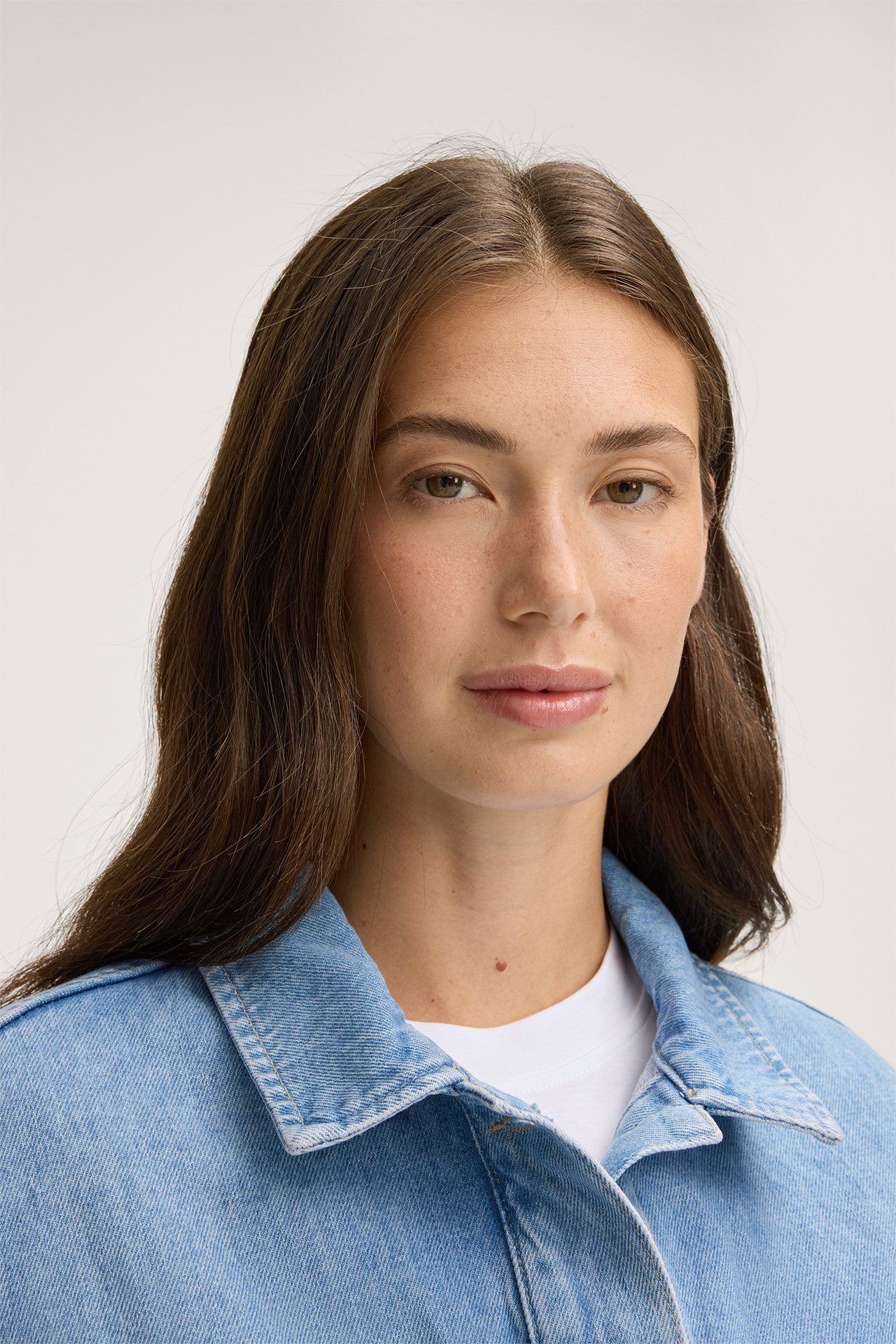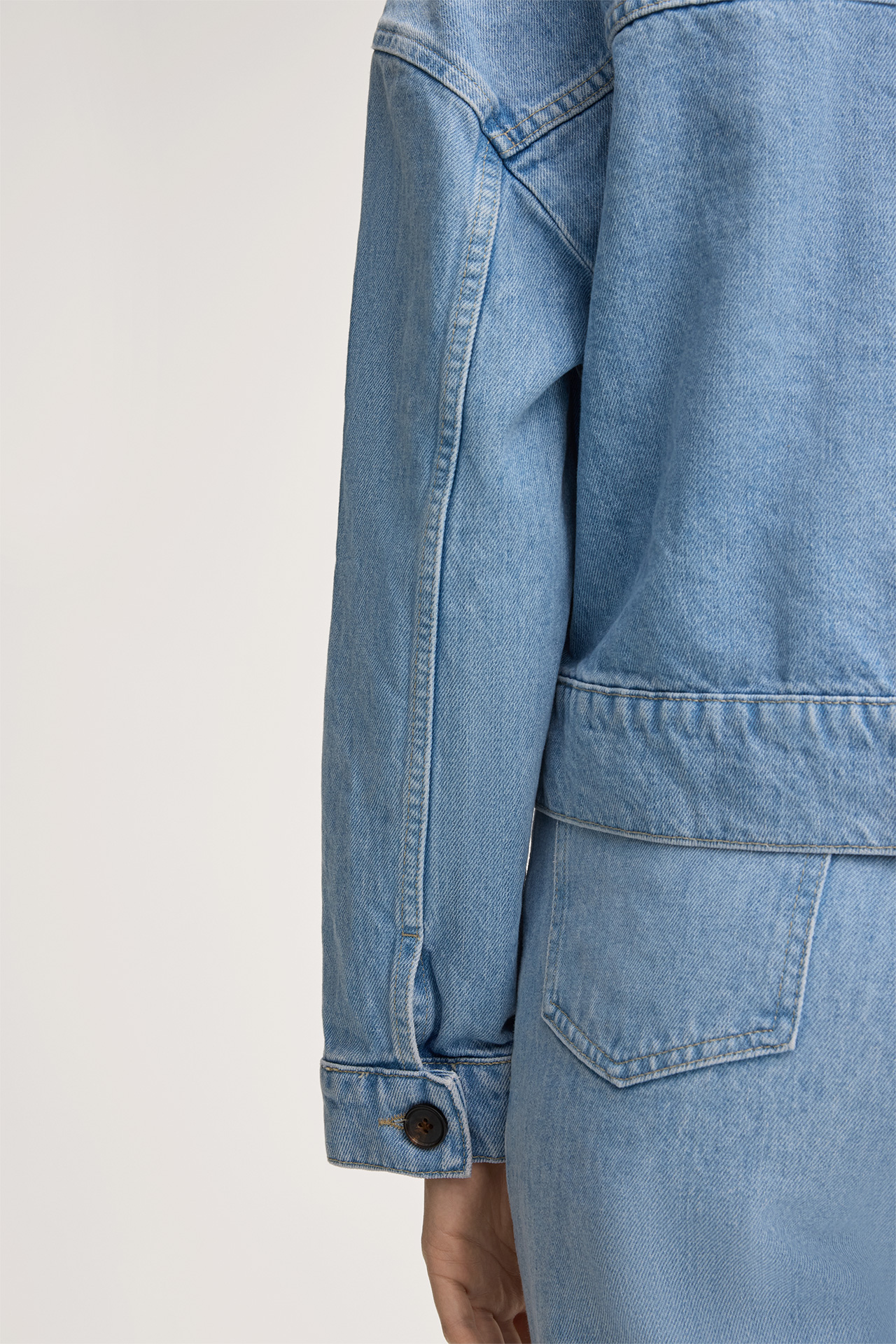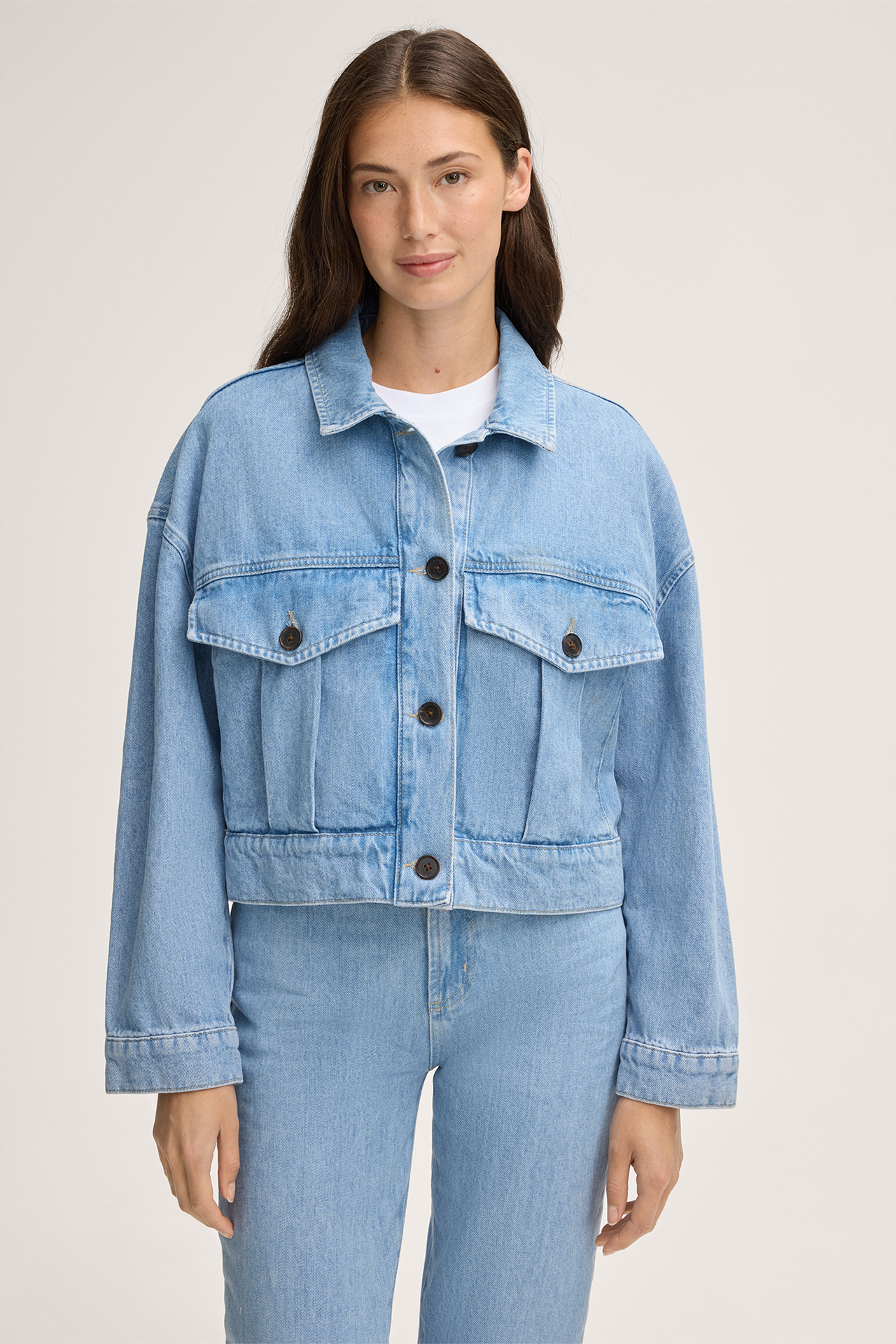 This denim jacket is a sophisticated piece with a casual twist and is ideal for versatile looks. The blouson look, accentuated by dropped shoulders and modern flap pockets, is a real eye-catcher. A classic button placket and turn-down collar round off the piece to perfection.