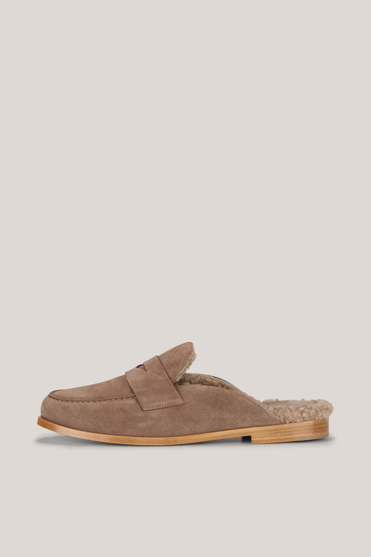 The soft teddy shearling inlay and exquisite suede give these loafers in mules design their luxurious look. The classic tab, decorative stitching and narrow sole in a monochrome design give them a modern upgrade, making them essential all-rounders with jeans and knitwear combos with a trench coat.
